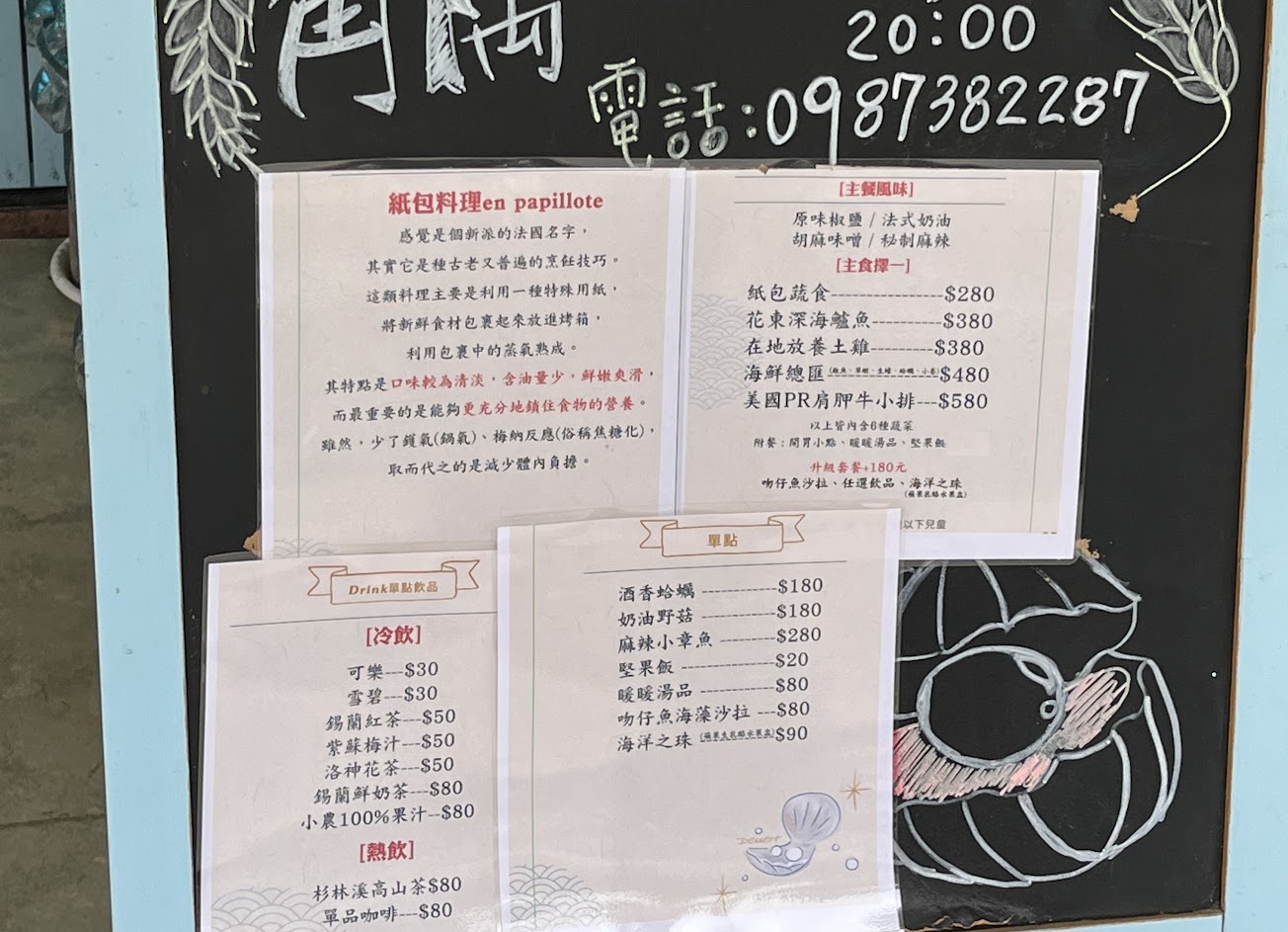 紙包料理頗具特色,吃得出食材的新鮮以及原味。紙包料理可以選擇四種調味,有原味椒鹽、法式奶油、味噌胡麻以及辣味。