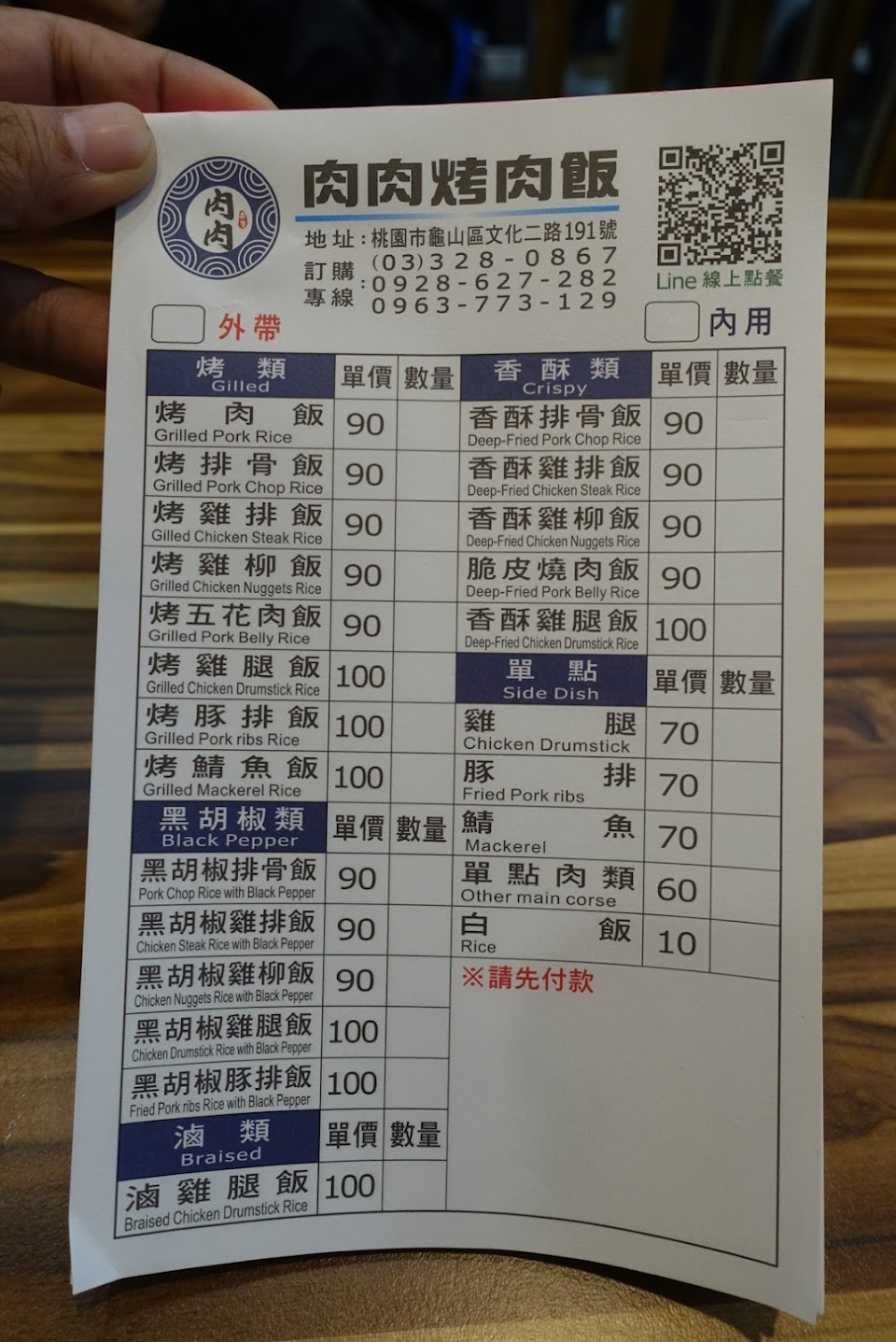 建議立個牌子寫現場外帶一律請先填單,要不然為了買一個便當排隊排了那麼久,因為沒有填在單子上,又要重新排隊一輪實在是很不合理。我理解店家為了方便管理及作業,規定一定得填單子,但是相關規定宣導不清楚是事實。
