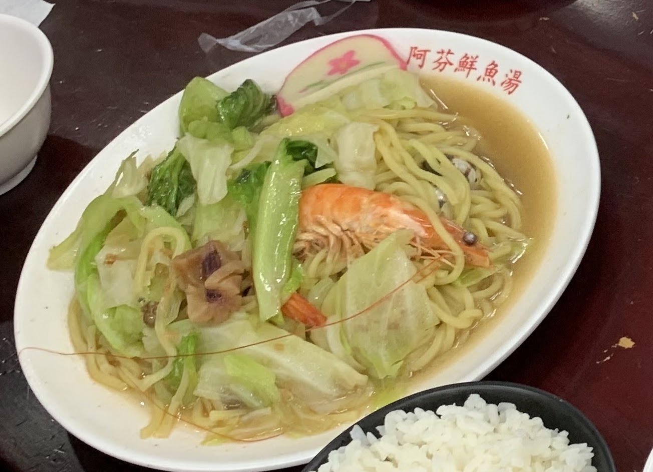 魚湯是鬼頭魚湯,再一次驗證無需高貴食材,只要新鮮,用最簡單調味,就成珍饈。海瓜子蠻下飯的,至於青菜、炒麵、炒飯,大概都是大鍋熱炒,隨時可以挖一勺上菜,不必想太多。