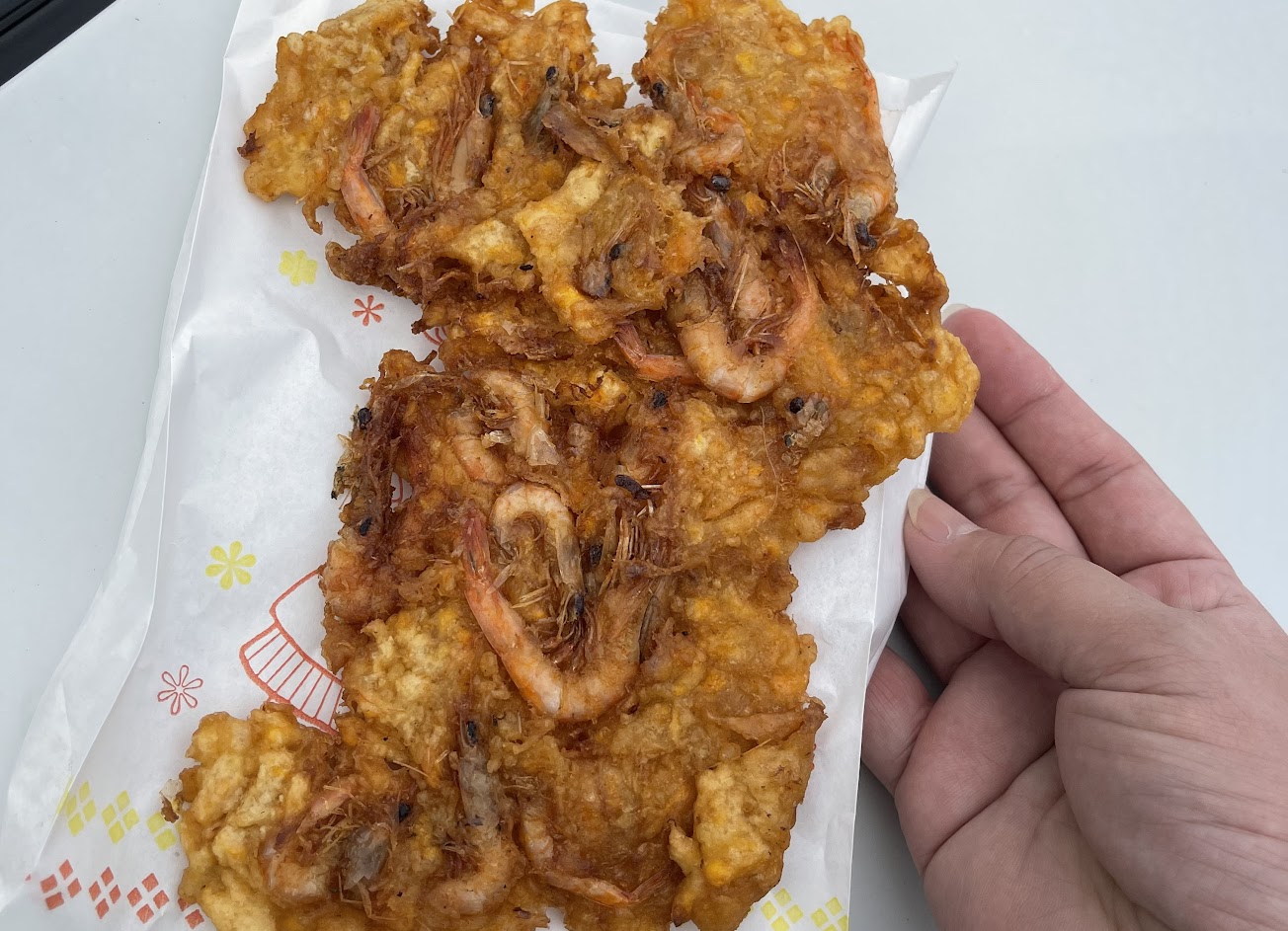 偶然經過發現無人排隊,立刻下車買了一個來吃,尺寸比想像中的大個,蕃薯泥配上蝦米很好吃,但畢竟是油炸物,吃多容易膩口,建議兩人一份即可。