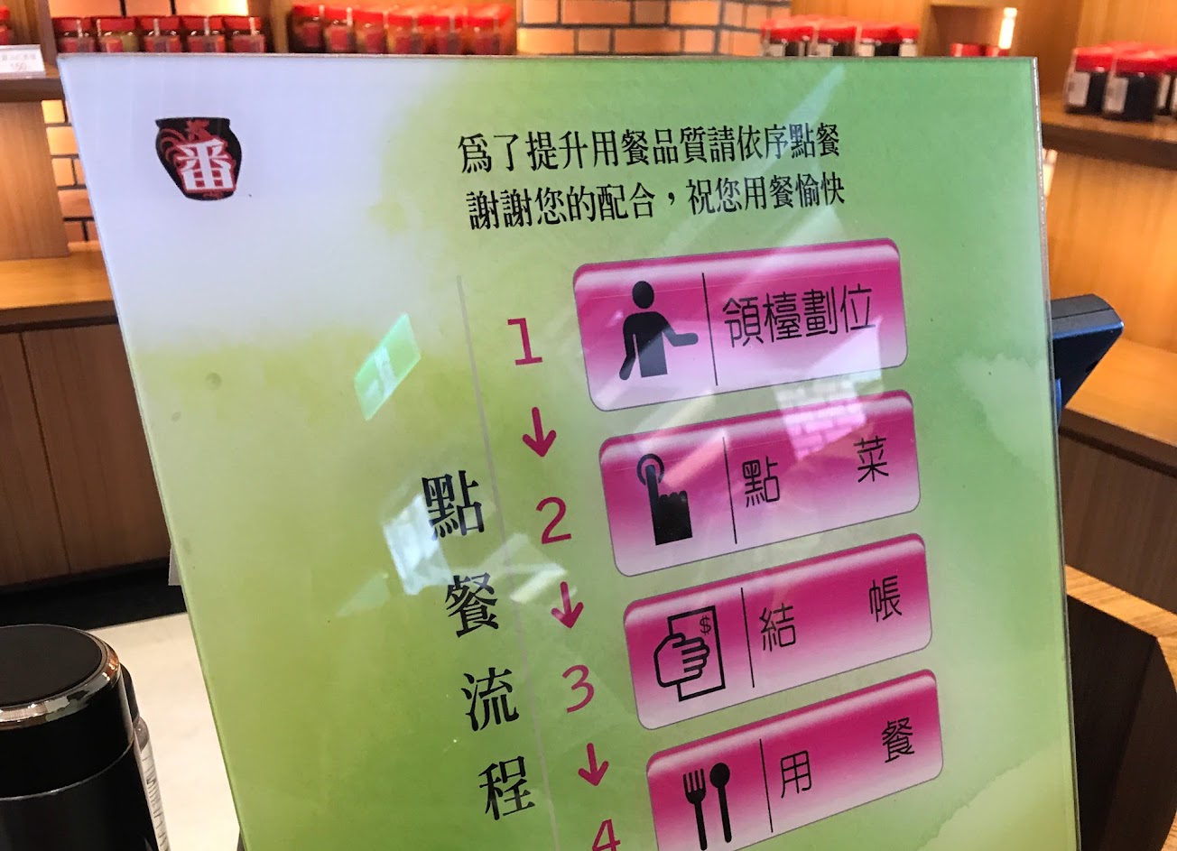 ✨拿號碼牌>點菜>等叫號帶位入座>付款>上菜