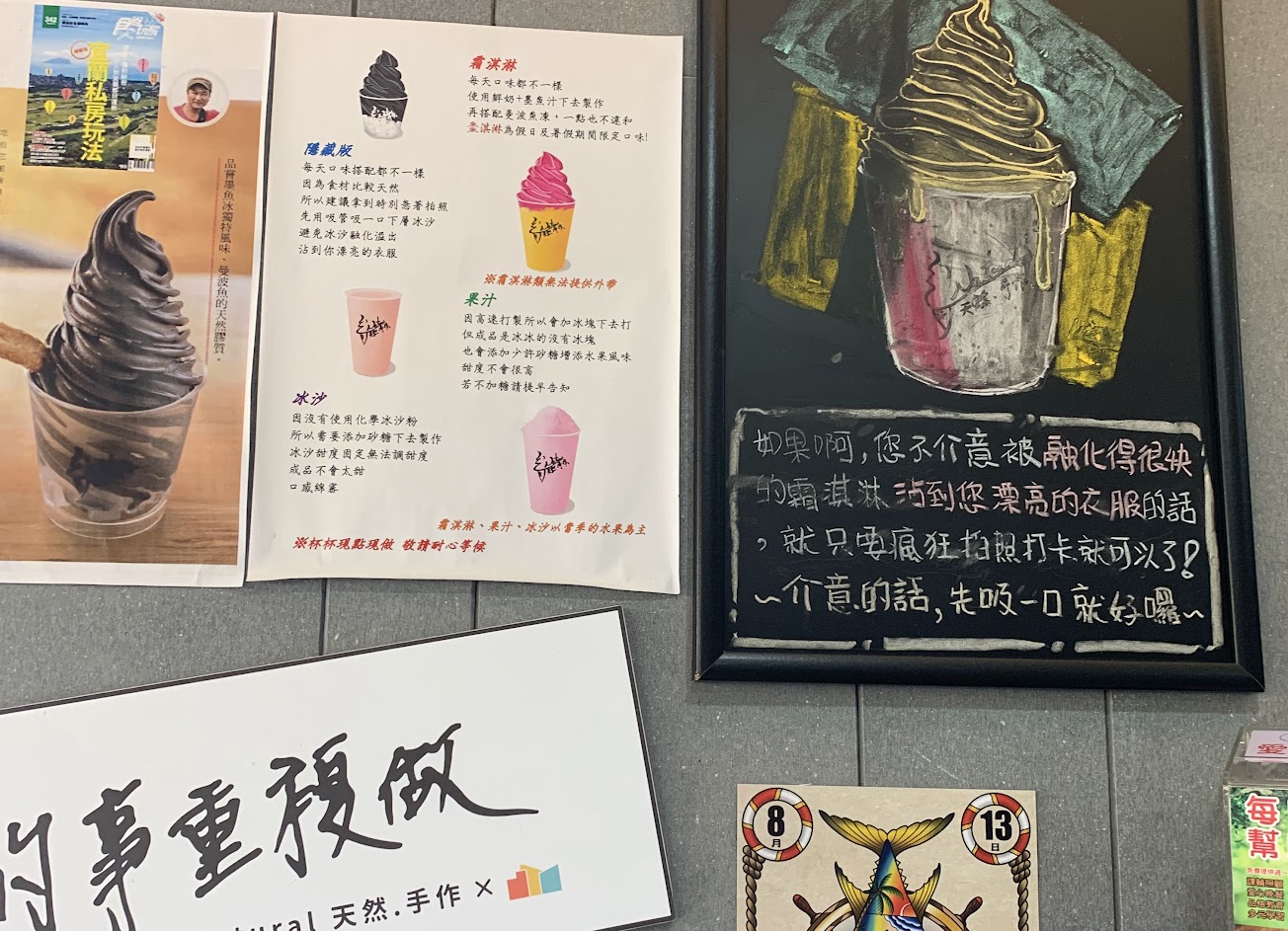 這次剛好選到了限定的墨魚霜淇淋,吃的滿嘴黑黑有夠好笑 其實墨魚味沒有想像的濃厚,也許是墨魚汁比較淡吧? 但這樣也好,濃郁的魚味霜淇淋我可不敢想像? 淡淡海味甜甜滋味,或許是最好的形容