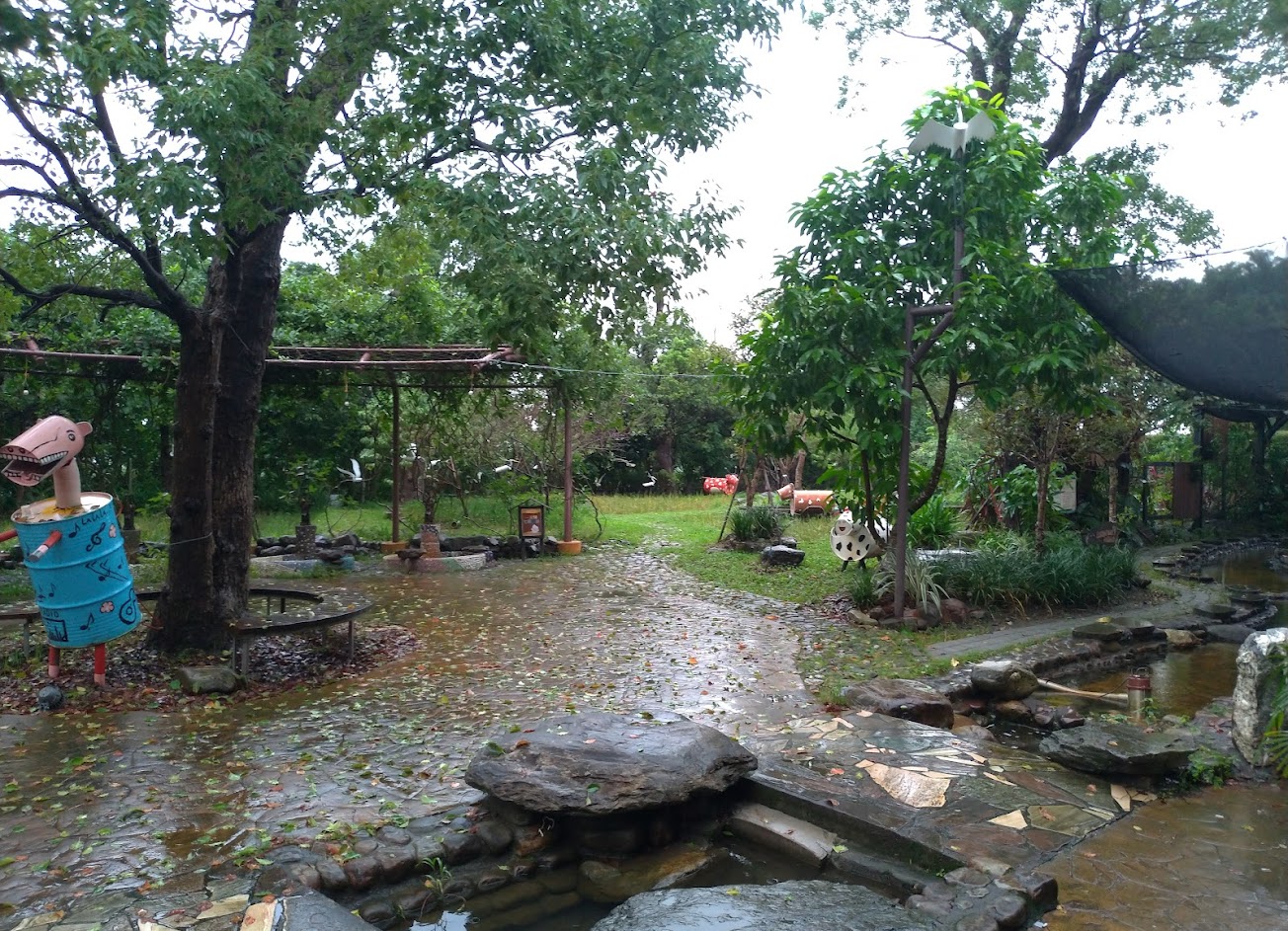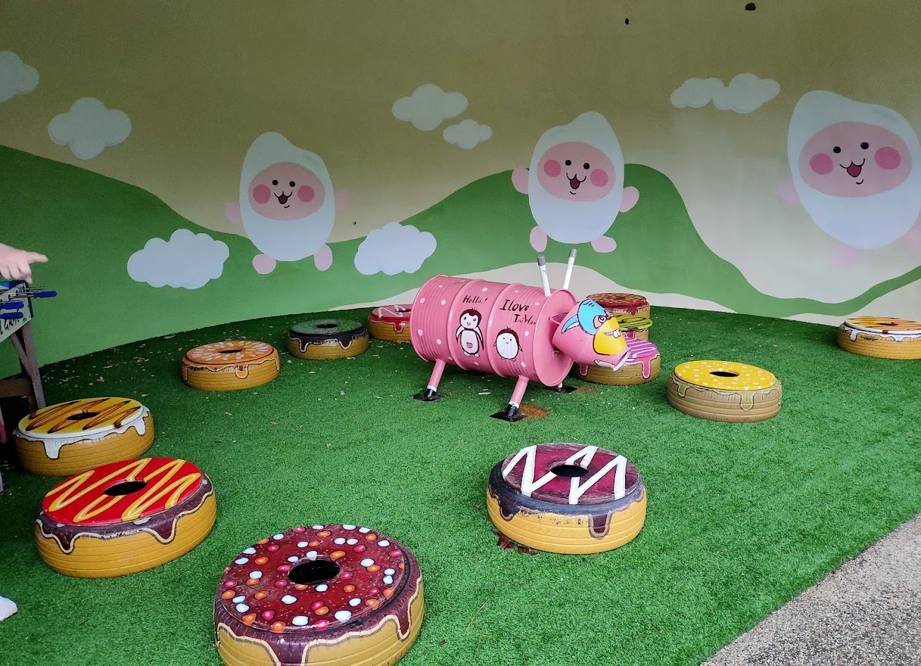 集合了購物及觀光資源,雖然園區不大,但處處可見到廠商用心在經營,盡量讓旅客放鬆心情,除了有卡拉OK、泡腳區、兒童遊戲區外,也利用了資源回收創造藝術品,連通往衛生間通道都佈置得藝術化,值得至此參觀。