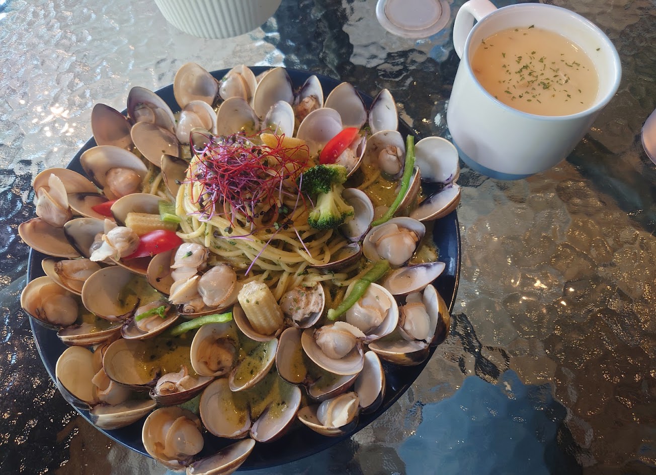 青醬蛤蜊義大利麵有滿滿的蛤蜊,但有點鹹,店員說冬天蛤蜊比較不會吐沙,所以還有海水的鹽,叻沙蝦義大利麵非常好吃。有小魚池可以泡腳。
