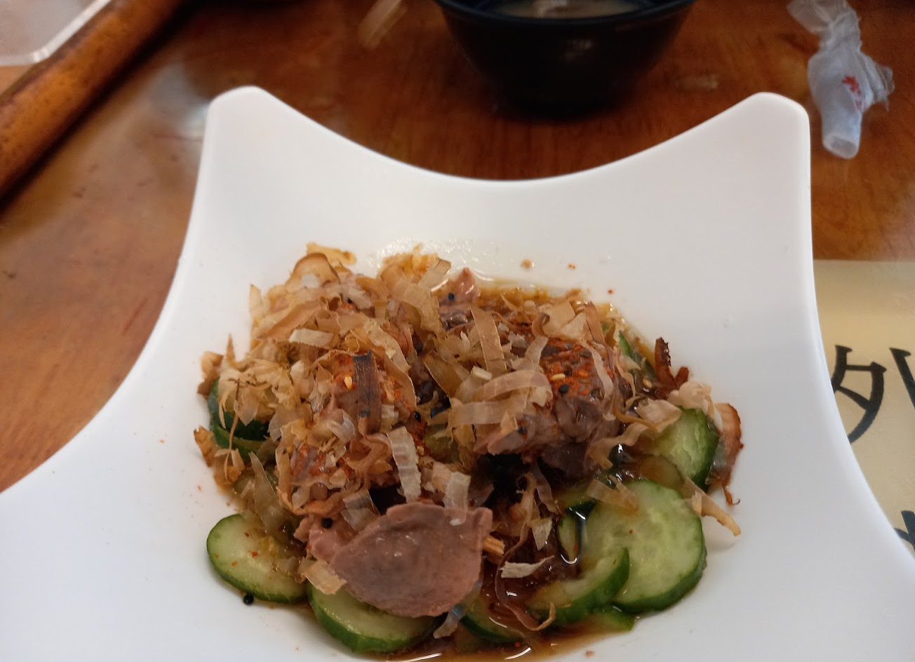 我們總共只點了 生魚片 牛肉丼飯 以及 日式炸豆腐 日式炸豆腐 整個浸泡在醬汁裡 炸得口感沒了 醬也沒有特別好吃 身為半個日本人 完全不知道他為啥叫日式 牛肉丼飯 吃起來很像初戀的味道 酸酸的 不知道加了什麼 而牛肉像是在吃橡皮筋 難吃 生魚片 切得很大塊 但怎麼咬就是無法吞下去 環境很老舊 桌上不是很乾淨 女店員態度有夠差 拿了張菜單 對著我比了一下桌子旁 原來他是想表達旁邊有筆 送上餐來 跟她說謝謝 臉還是很臭 不知道我是顧客還是她是顧客 總結 根本不用去 浪費錢 Ps 蝦子好像有爭議 因為飲水機旁貼著一張有關蝦子的澄清(好像 好像 好像)
