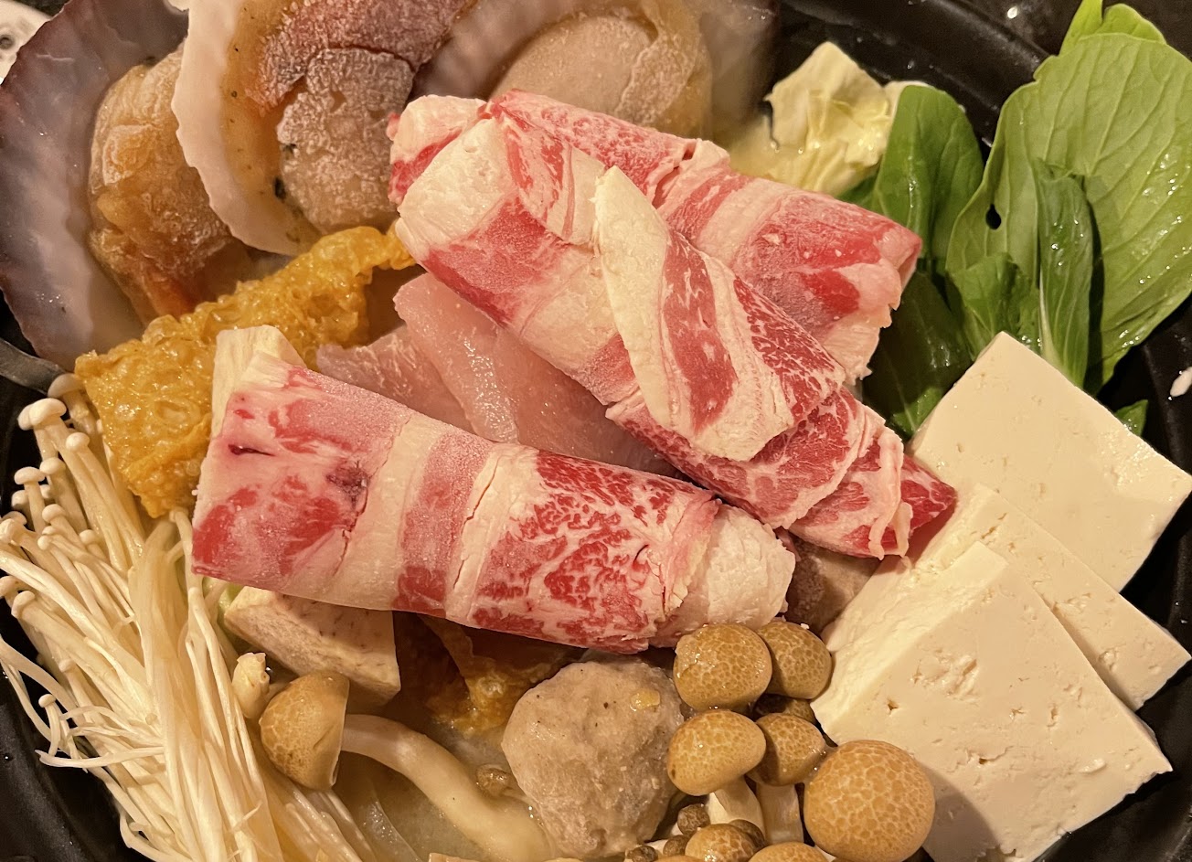 滿懷期待來此享受5星級的美食,980 的量非常令人有飽足感,我們選擇了龍虎斑及松阪豬,口感结實,套餐中亦包含刺身,但是魚肉含筋未軟化,再配上很嗆的’現磨芥末‘口感欠佳,生花枝還不錯。整體而言,應該會給予3~4 顆星,所以我沒有被送到火鍋肉