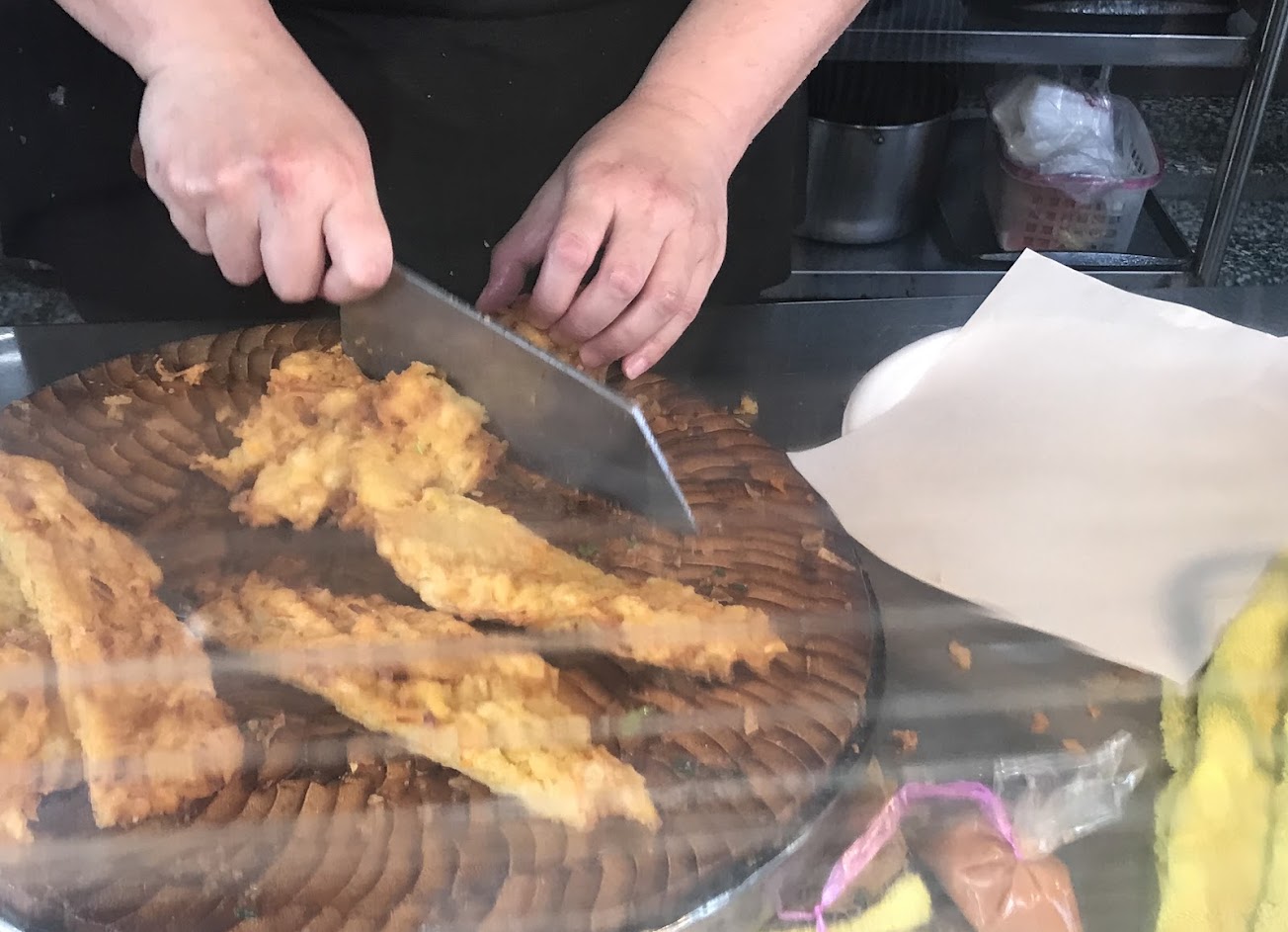 來晚了!蘿蔔糕居然已經賣完了。 炸韭菜春捲其韭菜很濃郁,沾著店家微辣的醬汁一起吃還不錯,炸蕃薯餅餅皮略硬、咬下脆脆的,一樣沾著微辣醬汁還不錯吃。