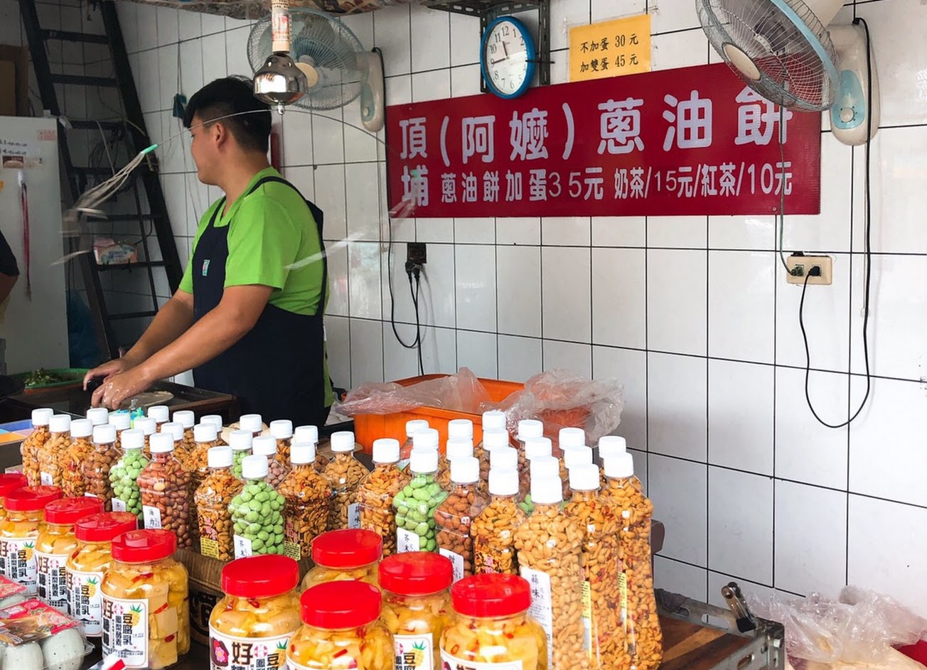 銅板美食、油炸蔥油餅+蛋 NT$35。油炸熱熱吃挺酥脆的、口感還不錯吃。店家阿姨都很親切、雖都要排隊、但排隊時間不長、炸蔥油餅的速度很快。飲料自助、買單後冰箱自取。花生米一瓶NT$110也不錯喔。