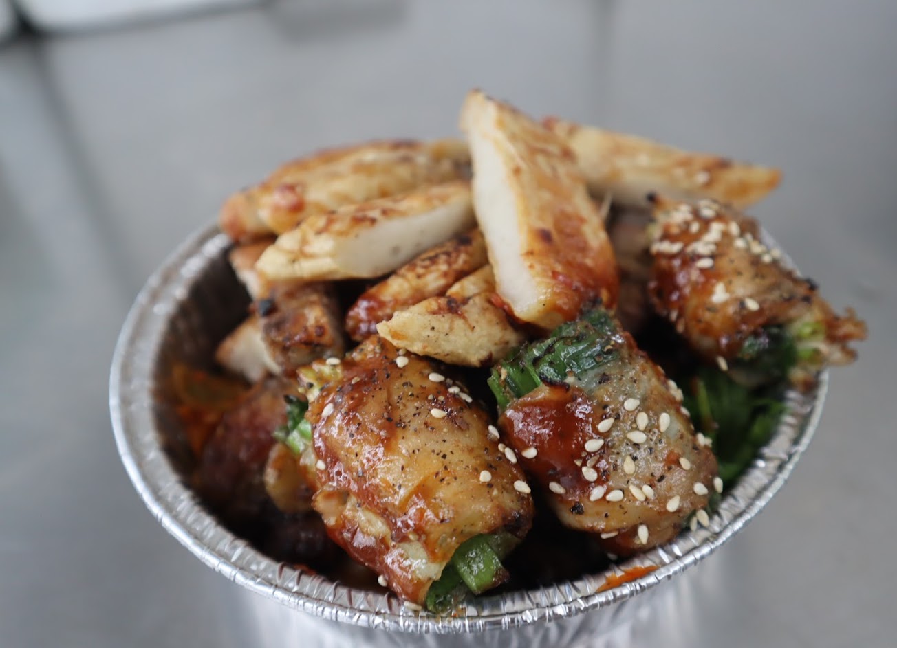 當天點了烤五花肉、蔥肉串、雞屁股、甜不辣,喜歡五花肉的味道,還加了滿滿的洋蔥、生菜、泡菜,超級對味。 本來還想吃雞心和泡菜肉串,可惜都沒了,希望下次能吃到 那天還有買旁邊婆婆賣的百香果冰沙,也很好喝