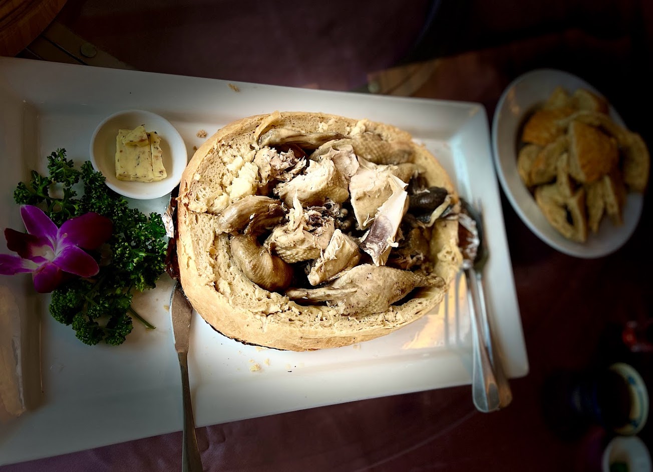 餐點挺有特色的,海鮮新鮮,麵包雞也很特別,尤其是麵包帶著金棗,越嚼越香。不過可惜雞肉就有點軟爛,調味也比較淡,不過配著湯汁就好多了。