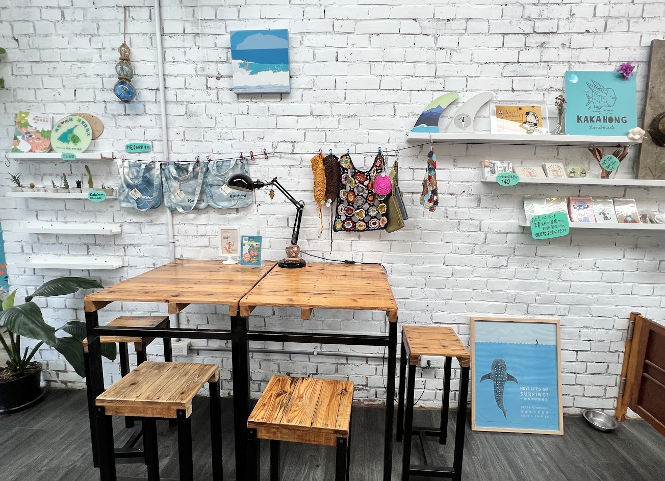 #店內有親人的狗狗們 #低消為一杯飲品 #後來發現喜歡的比基尼品牌誕生於一旁連棟的白屋裡 #部分座位有插座 #店內有販售許多衝浪與海洋相關元素的選物