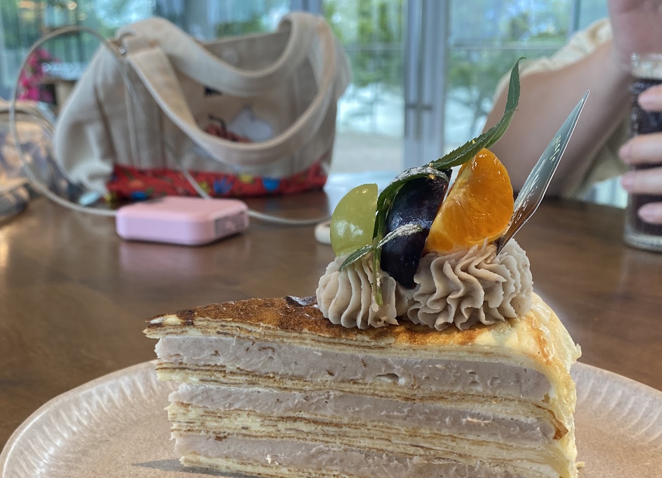 遛老人跟嬰兒蠻好的去處 附近可以看看海走走 呼吸一下海鹹鹹的味道 千層蛋糕在宜蘭蠻有名的 實際吃覺得還不錯 吃起來不會像在吃蛋皮 但我依然吃不懂千層只知道一層一層一層 很麻煩 媽媽覺得墨玄很好吃 不管芝麻、焙茶 都是很濃郁的味道 個人最喜歡本和香糖布丁? 芋泥千層則是微甜的芋泥 甜度很低