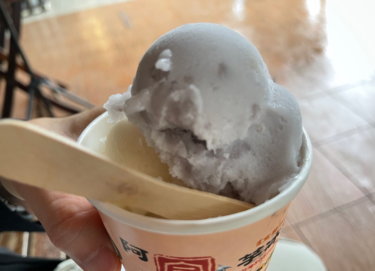 原本不在行程中,意外走到了名店。 很古早味,店面古色古香,保留著傳統賣冰腳踏車,媽媽看了湧上很多小時候的回億。 3球50元,這次點了芋頭、桂圓、花生,花生顆粒很多,桂圓也有顆粒,很傳統味,不是現在牛奶重的雙淇淋,這個價格很ok。