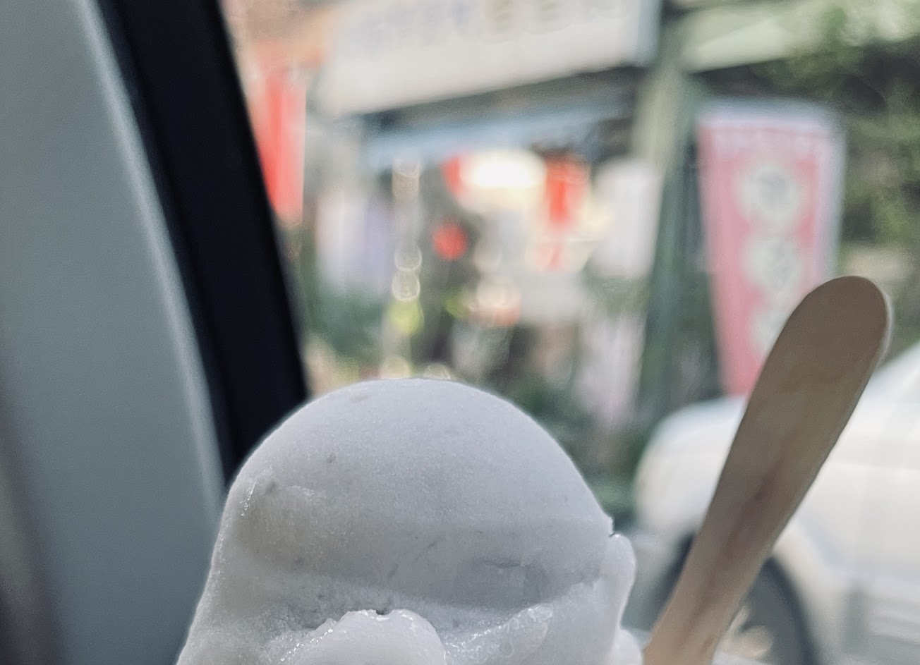 購買方式很簡單,一份55元選三球,七種口味可以選。基本上除了花生與芋頭以外,其他的口味我們也不太敢嚐試!室外體感溫度近30度,冰淇淋融化超快!選到不敢吃的口味放在車上也是個不穩定因速的災難!