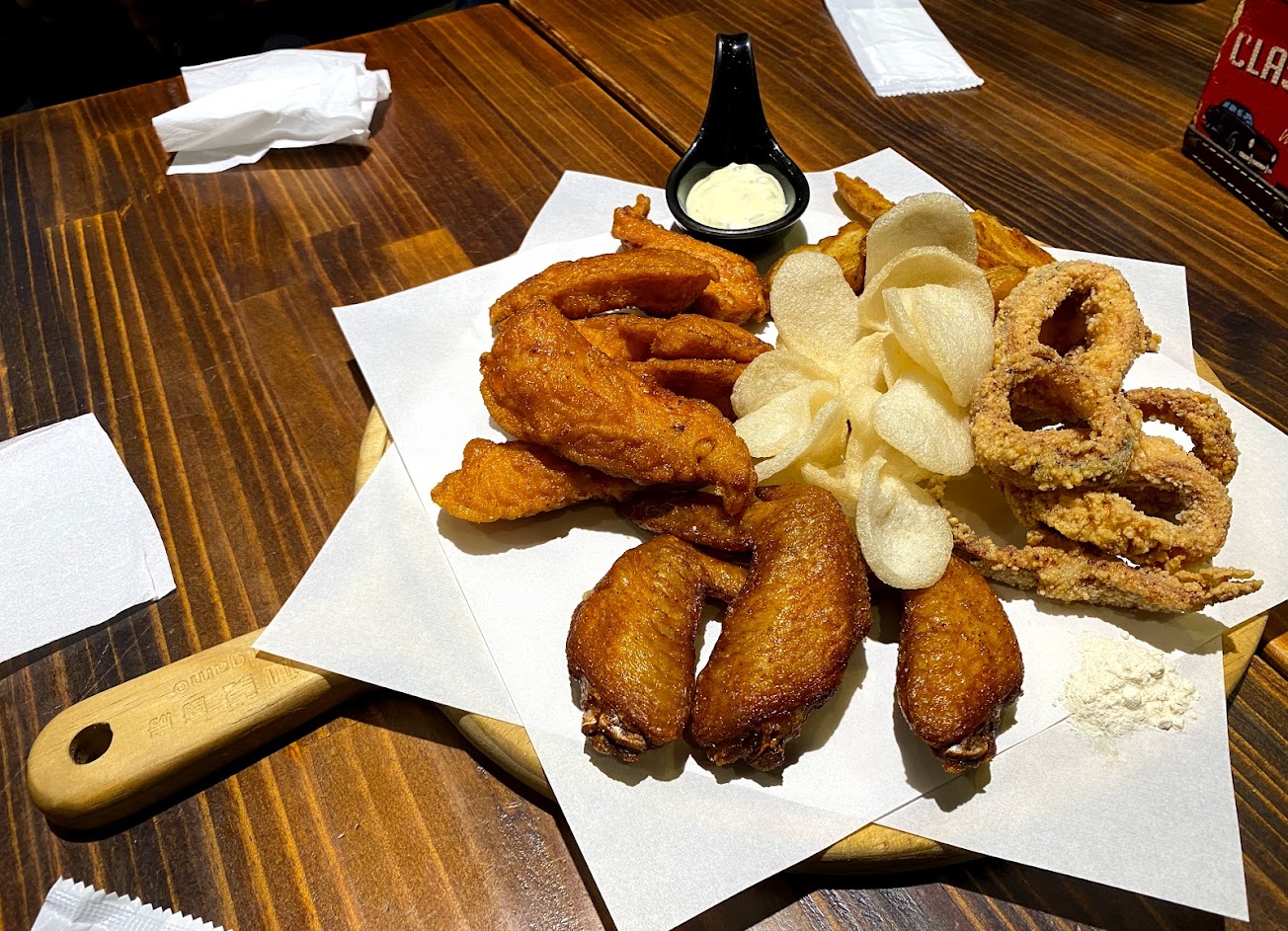 總匯炸物拼盤(炸雞柳、魷魚、薯條、蝦餅、雞翅):炸魷魚像是鹹酥雞的味道,雞翅有點乾,整體味道普通,價格偏貴。