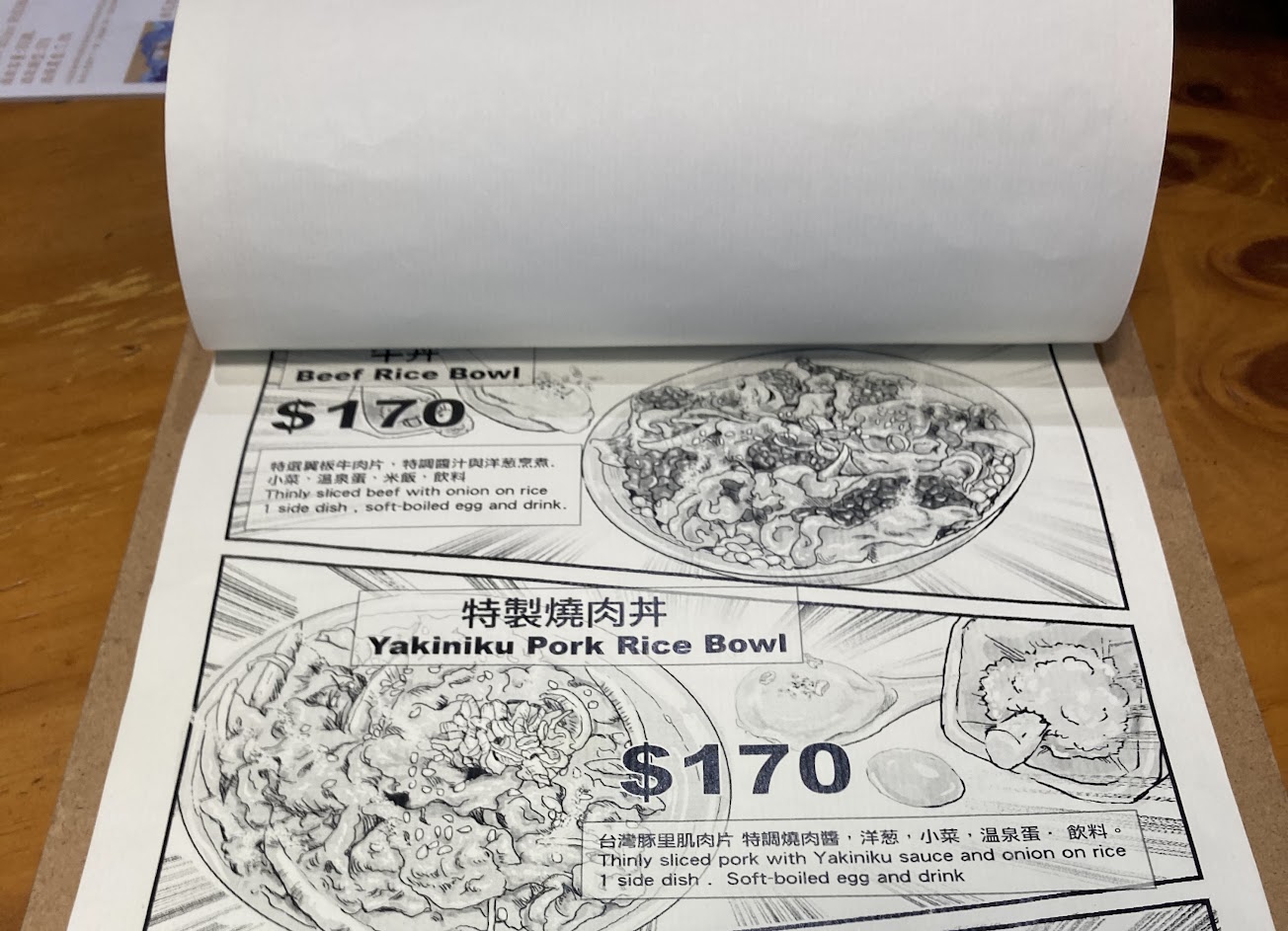 食物方面很不錯,點選各項主食皆有附小菜和飲料,多人用餐可以加點炸物。菜單的手繪風格很讚,與實際餐點很吻合,感受度加分。