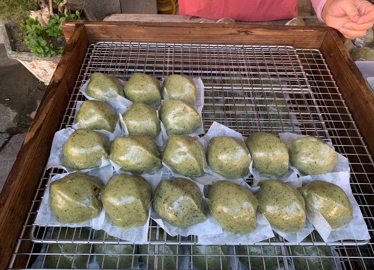 草仔粿太好吃了,一顆35元,三顆100,口味任選。有店面,老街上也有小推車。我都很喜歡。艾草皮香甜軟Q,內餡充滿胡椒及幹蘿蔔絲的香氣,重點是不油膩。完美比例讓全車的人都驚豔。吃完我們馬上又折去再買一輪。還有素食的菜包耶,超讚。