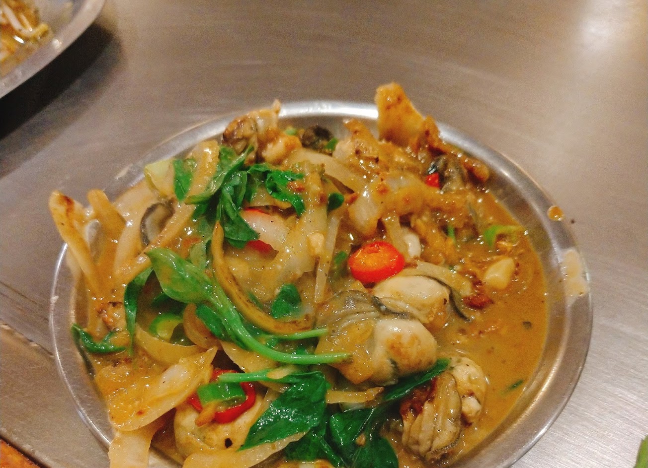 好吃的鐵板燒,口味不錯,不會太鹹或太油!而且青菜居然還可以自己四選二,有菠菜、豆芽菜、高麗菜、小白菜。用餐後還可以去旁邊的咖啡座喝飲料吃冰淇淋。今天點了蔥爆鮮蚵還有小里肌豬排,鮮蚵很新鮮、豬排也很嫩呢!