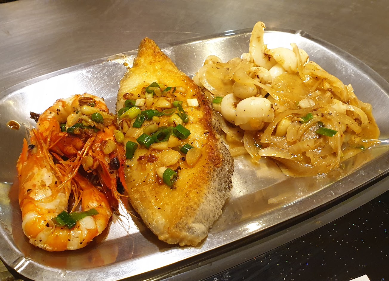 1.白飯、海帶湯、玉米濃湯、飲料、冰淇淋(普普)無限續。 2.青菜多種可選,很配飯。 3.主餐羊排、比目魚也很下飯。 4.鐵板燒師傅非常親切。 5.餐桌摸起來有點黏(扣分在用餐環境) 6.打卡、評論五星可換東西。