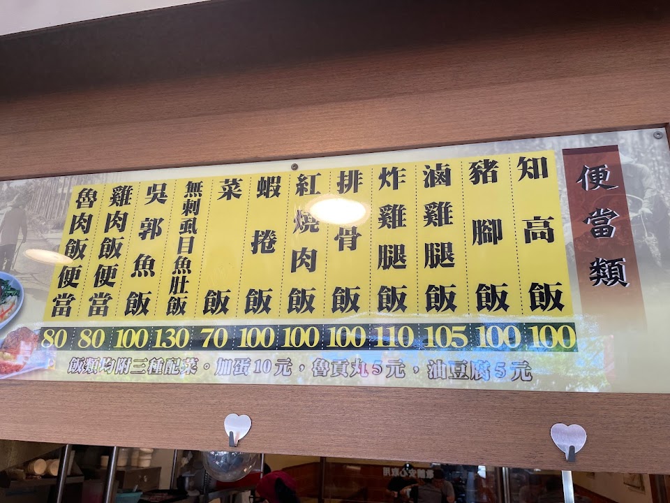 知高飯90元:米粒完整沒有破,應該是新米,米的等級不錯,配菜有豆輪,四季豆,滷蘿蔔,絲瓜冬粉,因為絲瓜的醬汁全部沾滿了米飯,所以吃不出來米飯Q不Q,這點建議要改善,不要在白飯淋上菜汁。肉的部分稍嫌少,肥肉軟爛,入口即化,不過還是感覺的到油脂感,瘦肉部分就有點乾柴,剛好配到我最不喜歡的部位。 竹筍湯30元:竹筍很嫩,店家有確實的去除竹筍老的部分,湯頭跟白開水差不多,可能是我中午12:00去吃的,有可能到晚上湯頭就會有大骨的味道了。 環境乾淨,整潔,有洗手間,有辣蘿蔔,辣椒,桌上也有透明的隔板,整體感受算不錯,唯獨冷氣真的很不冷應該是29~30度,這個建議可以改善一下!