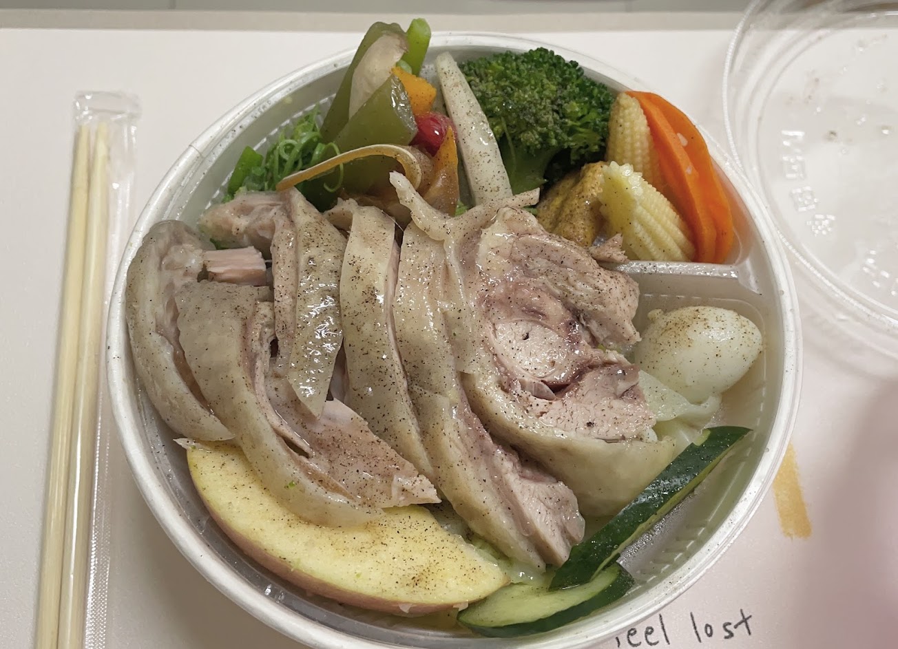 我點的是油雞腿低脂椒鹽餐盒,也有醉雞腿、油(醉)雞綜合餐盒可選擇。餐盒中有10幾種蔬菜,營養均衡,很適合每次單點有選擇障礙的人!下層的白飯有淋一層醬、椒鹽非常下飯,也有附一包醬汁可以淋在豐富的配菜上,不過如果喜歡清淡的人我覺得不加醬汁味道也足夠了!每當天氣漸熱的時候不想吃熱食或炸物,就會想到這裡單點些蔬菜或套餐~