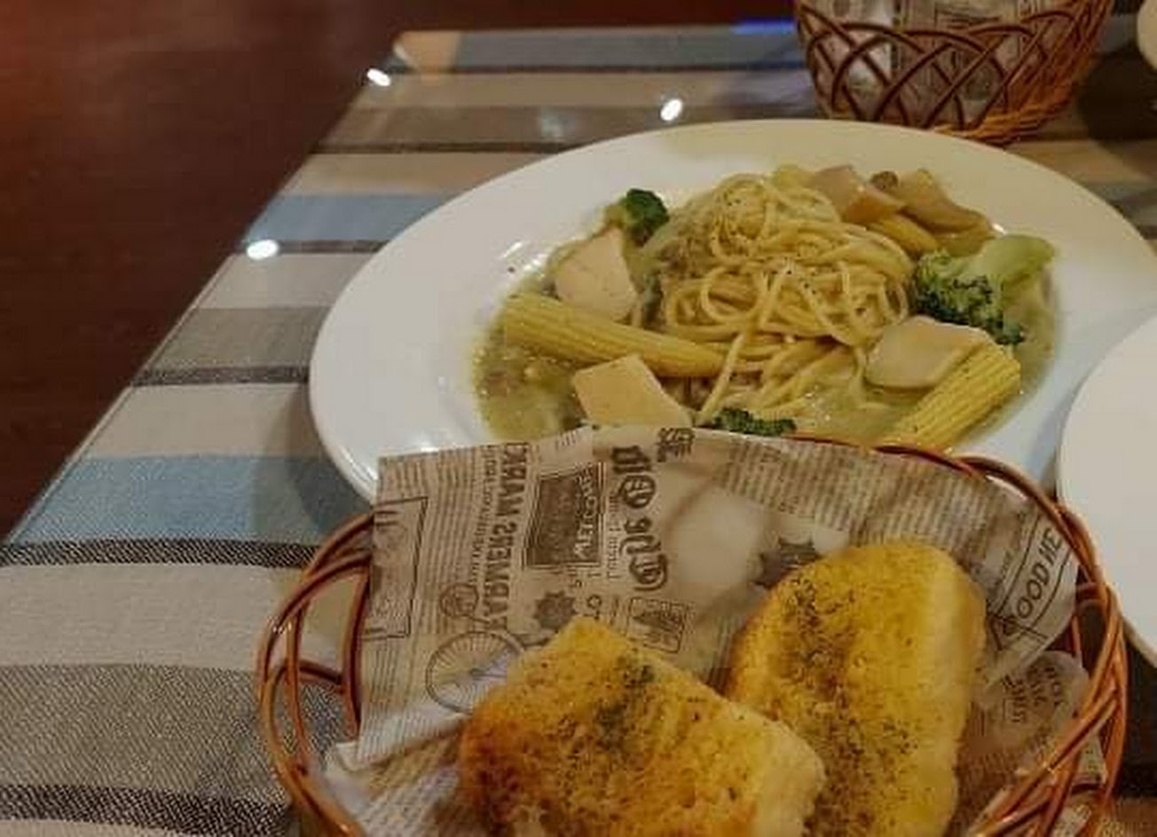 最後選擇了蔬菜香蒜意大利面和培根芝士漢堡。並開始喝雜燴湯和檸檬茶。
