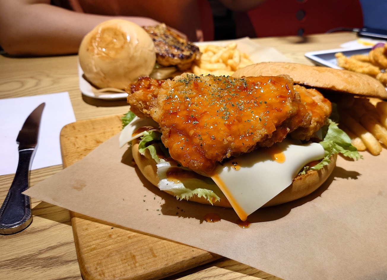 3. 板烤雞腿堡的味道不錯,肉很大塊,生菜、洋蔥、番茄、酸黃瓜(雖然我不太敢吃)、起司片和醬汁的搭配很順口又有層次感,不過因為是拿著吃,所以醬汁會集中到後半段,吃到最後會覺得有點鹹。橙汁脆皮雞腿堡不錯,但橙汁的部分不是很明顯。如果不敢吃生菜可以跟店家反映把漢堡裡的生菜拿掉