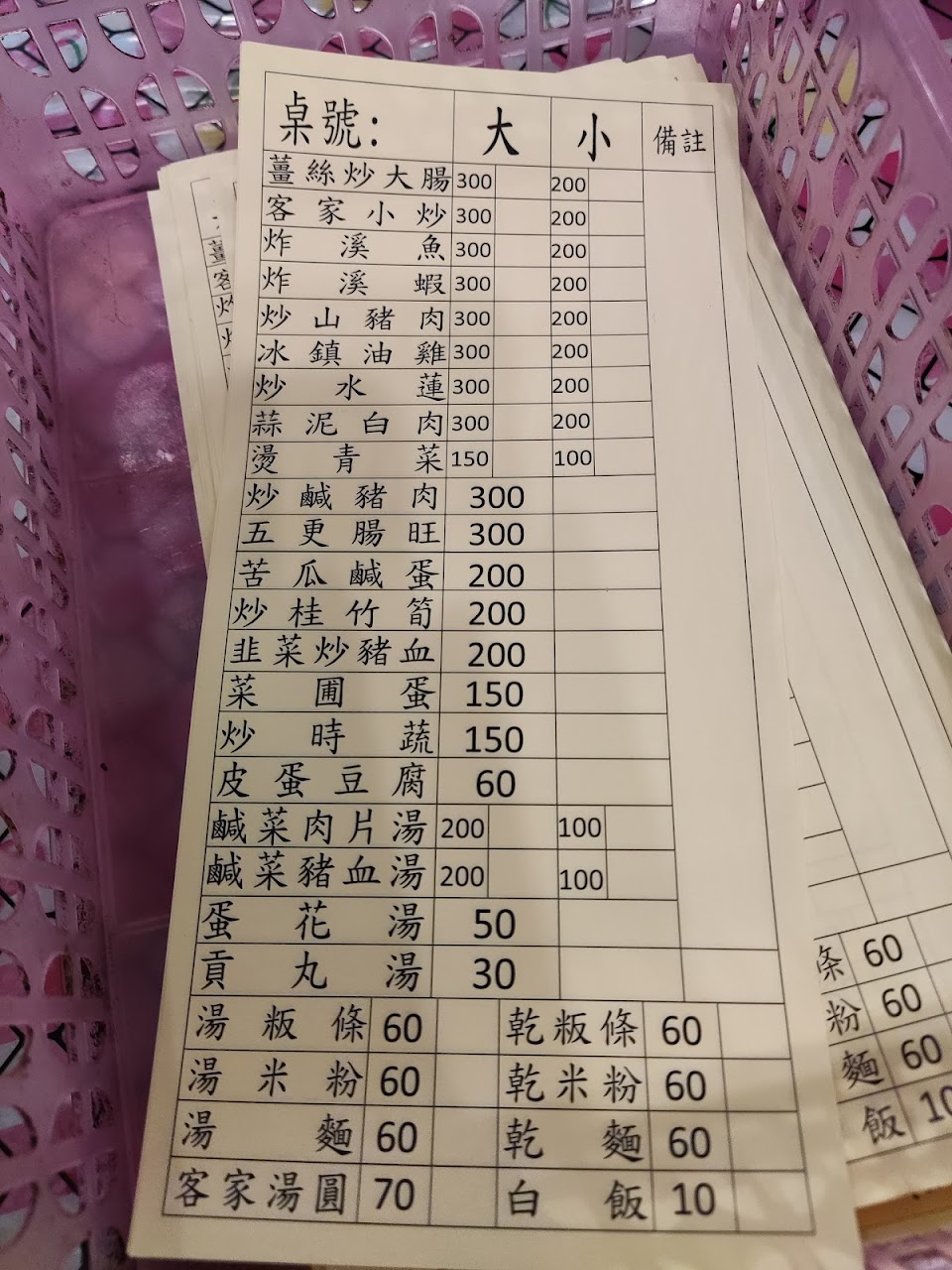許多家都是寫老店,這家是60年的,嘗試後確實不是很喜歡,原因在照片有說明,上菜速度蠻快的,不知道是不是這樣品質就不穩定,粄條湯圓就是一般,有一點油,炒菜是真的油,客家小炒更是燒焦,有濃濃的焦苦味,又是一個殘念。