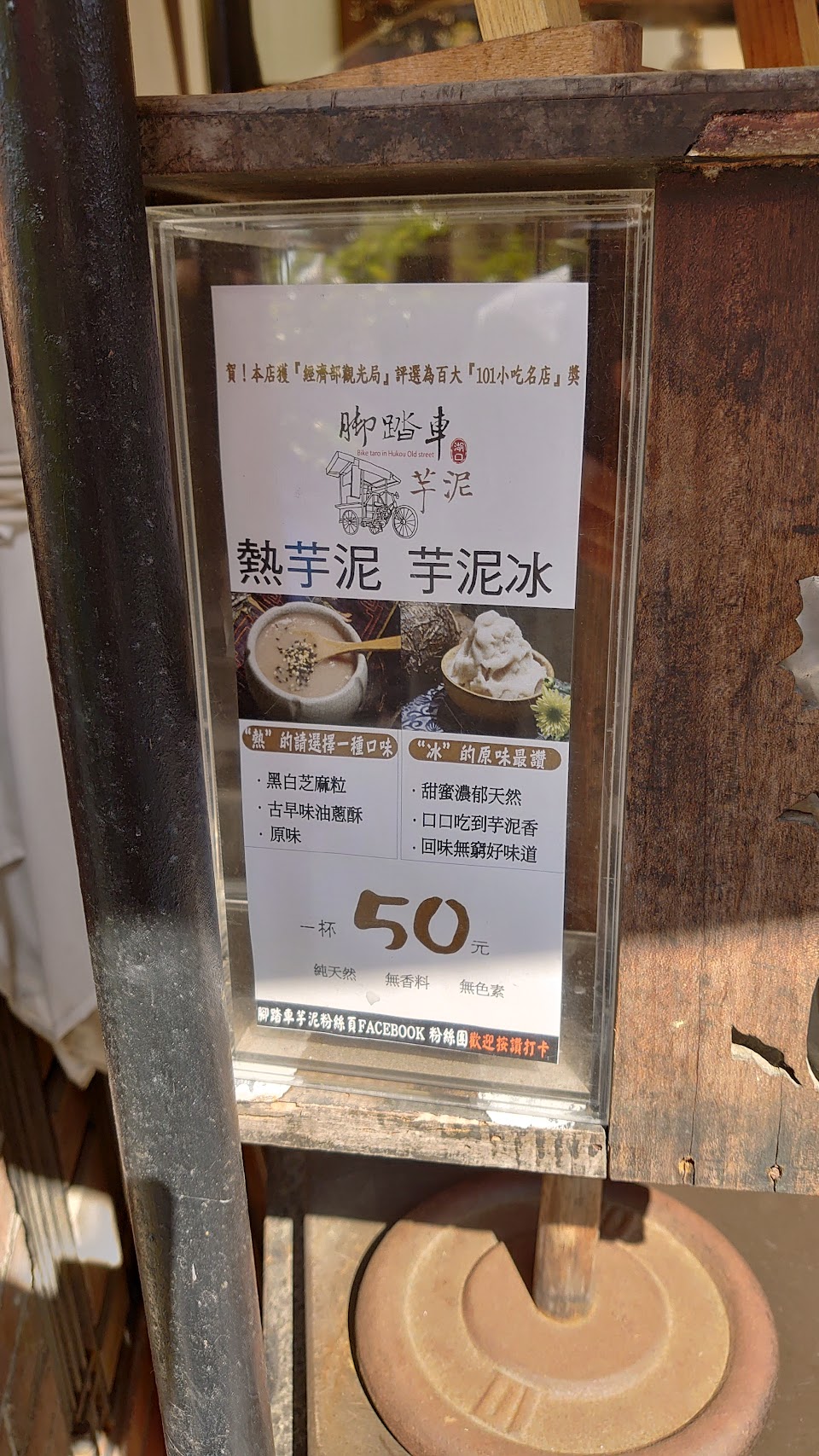 店主不在的時候,敲鐘的恥度要夠大,因為超~~大~~聲~~的,敲完感覺整條老街觀光客都在看這裡,變成全場焦點! 熱芋泥有黑白芝麻粒、古早味油蔥及原味,3種口味。可惜的是只有假日會開,如果平日的話~~就只能跟腳踏車拍拍照了。 熱芋泥像芋頭湯一樣,冷掉以後才比較像芋泥,沒有加防腐劑及人工香料,所以連小朋友都可以安心食用!