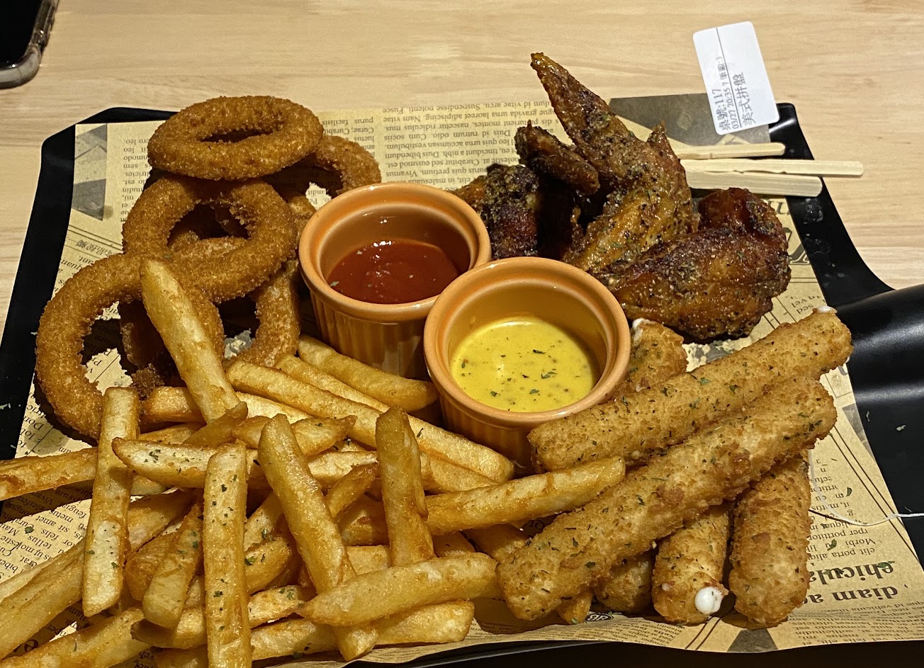 炸物拼盤好吃,炸雞翅超級鹹。套餐附湯是冷的。草莓奇異果茶好喝。好處不收服務費。