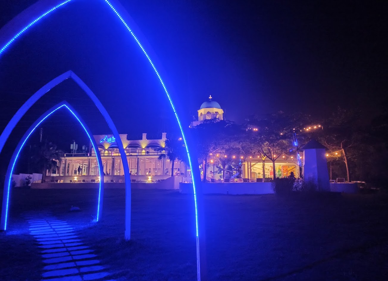 藍白色主建築物是最大特點,搭配大片綠色草坪,有婚紗造景及教堂元素美拍,美妙浪漫很受喜愛,可以從夕陽看到夜景,週休假日來山上是不錯的選擇,不能出國來山丘上景觀咖啡館更能享受休閒浪漫風情。