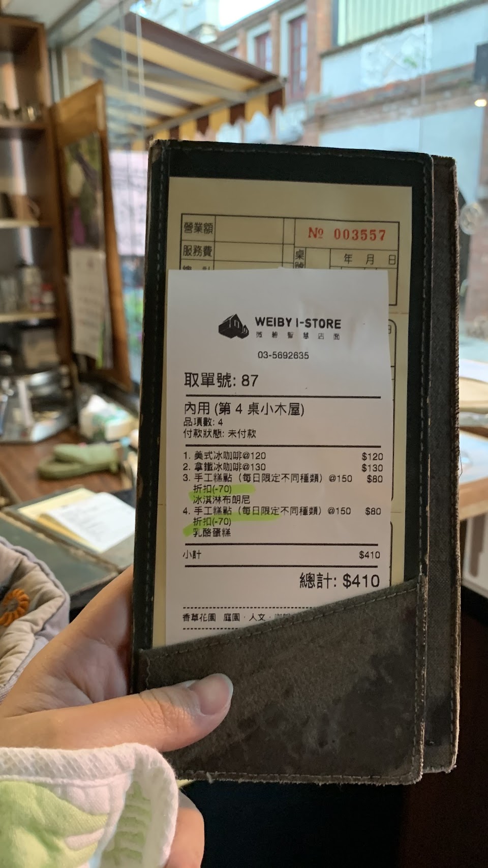 男生和女生店員都非常親切,應該是老闆和老闆娘吧! 本來我們坐戶外區,後來覺得有小蚊子,我們就換到裡面白色小屋的室內坐位區,他們沒有覺得麻煩,一樣滿臉笑容,真的非常親切。