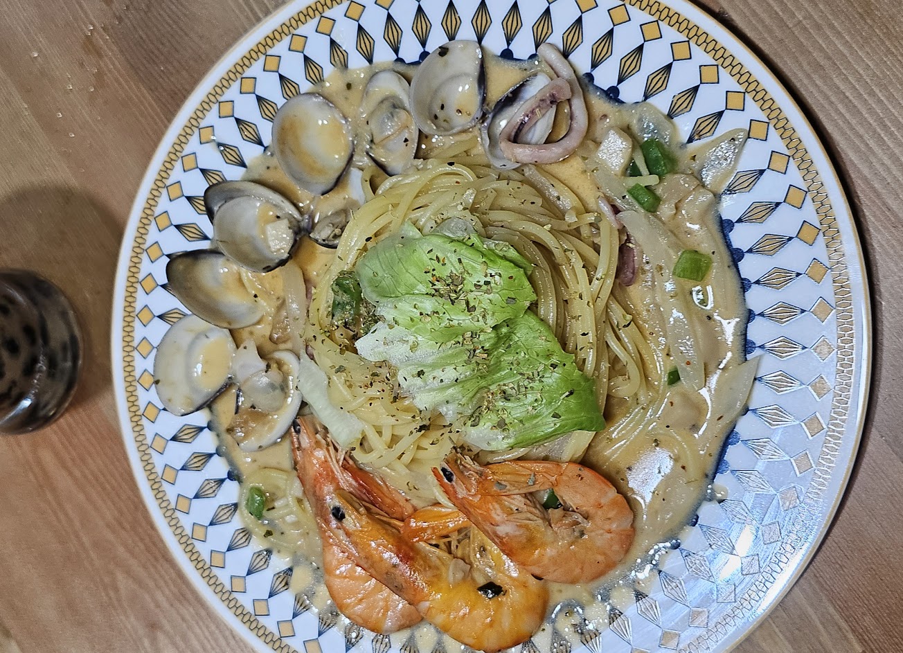 有大蝦、蛤蠣跟透抽,尤其蝦肉?新鮮飽滿。不過可能是白醬放的少了點,也是好吃,但卻吃不太出來跟清炒口味的差異。