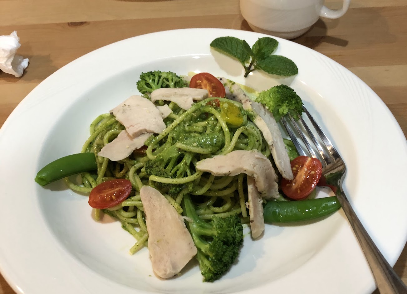 本人單點一份義大利麵還會搭配一旁的紅茶,在準備開動時送餐人員會細心介紹義大利麵佐料的蔬菜是自己店面種植的蔬菜,花椰菜、小番茄、豌豆表現充滿水份以及較嚼勁,不失有機蔬菜的程度。但青醬表現就一般般沒有特別驚艷,雞肉部分蠻鬆軟的,沒有很多嚼勁,因為本人比較喜愛嚼勁的雞肉,以上評論都是已我自己心情而表達。並不是說店面餐點不好,而是講述自我食的心得。