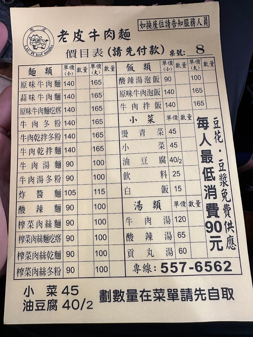內用必須自己先找到座位,說實話用搶位子或許更貼切哦!桌上的菜單填單完成再往櫃檯區排隊結帳,忙吧!看不出服務業應有的親切感,上菜的服務人員也都面無表情。麵食與小菜尚可。