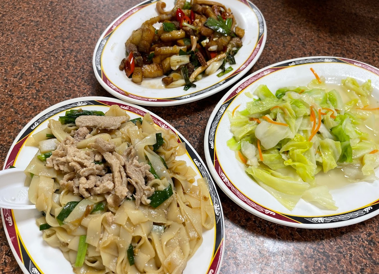三人點了鴨肉、客家小炒、高麗菜、炒粄條、炒米粉,口味剛剛好不會太油太鹹,經濟實惠。