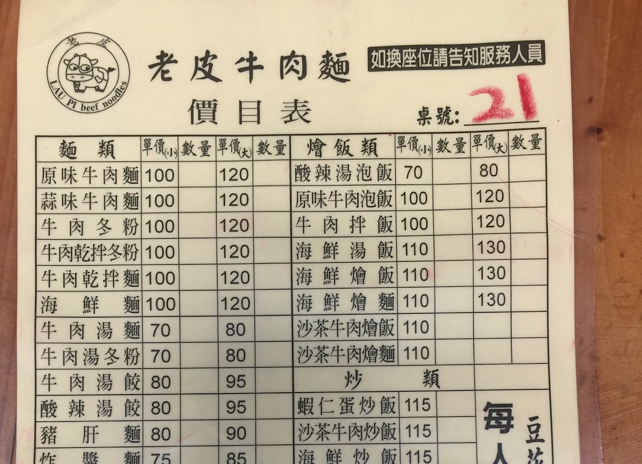 免費豆花和豆漿,原味、蒜味牛肉麵均一價$100。麵條很有嚼勁,小菜也不錯吃!點餐是先找座位,座位有單、點完放櫃檯,食物都到齊了就會把單交給你,用餐完畢拿單到櫃檯結帳即可~