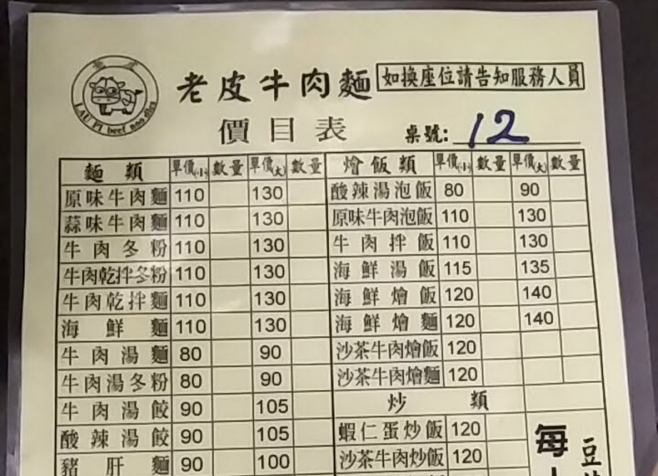 2019/09/27 中午到訪。 【主觀評論】 環境:白天照明普通,部分區域偏弱,用餐環境寬敞,座位設計多樣,適合不同用餐人數選擇,冷氣舒適,桌面殘留部分油漬,環保餐具、醬料放置於櫃檯旁邊。 服務:主動接待招呼,採取自助式找位、劃單,餐後結帳,小菜($40/盤)、油豆腐($30/塊)放在櫃檯旁邊自己挑選,溫微甜豆漿、常溫豆花、溫薑汁(稍微偏甜)放在靠近廚房區域,免費提供食客取用。 餐點: 1、原味牛肉麵(小)($110):撒著蔥花,當日提供4塊帶筋牛肉,燉煮得相當軟嫩,麵條過於透爛,湯頭鹹淡、油膩適宜。 2、豆漿(溫)(微甜)(免費):甜度偏低,值得嘗試。 3、豆花(常溫)(免費):溫薑汁稍微甜,豆花綿密,值得嘗試。
