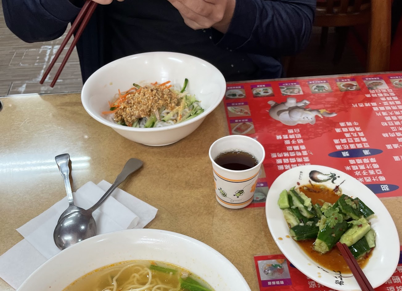 今日午餐: 叉燒肉絲乾麵、涼拌米線、椒麻雞飯、涼拌碗豆粉 都好吃!