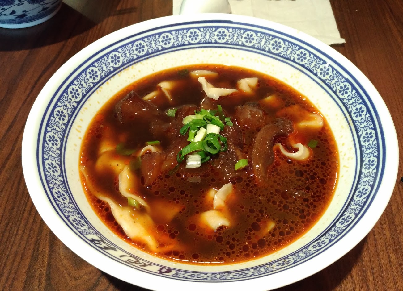 有麻辣火鍋湯頭的牛肉麵,口味特別。魯菜水準不錯,桌子多客人更多,不過帶位算有效率。
