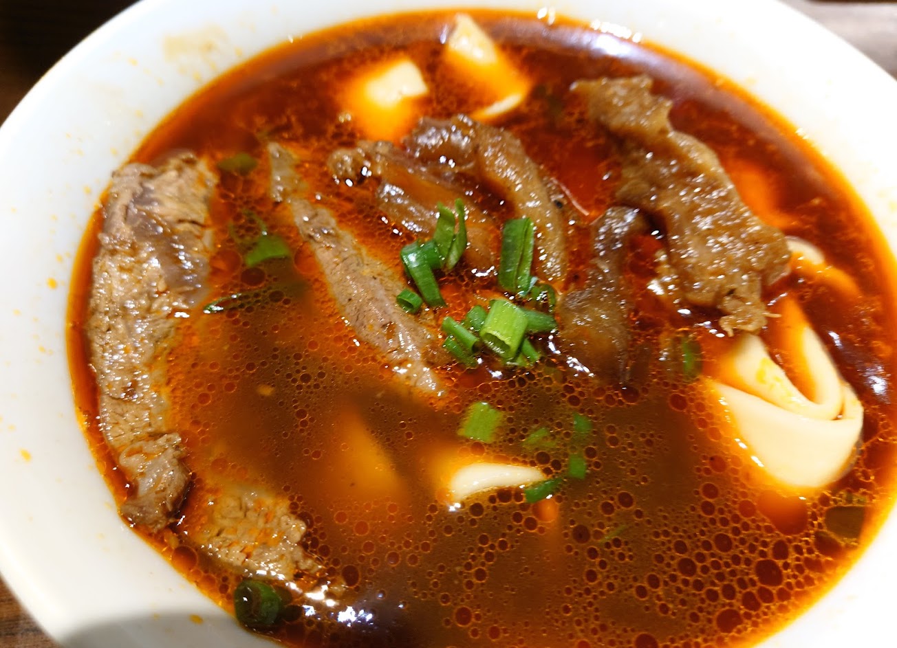 超喜歡的一家牛肉麵店,尤其喜歡他的手工麵,大約寬度3公分,厚度0.4公分,像是褲帶麵,很有嚼勁好吃!紅燒湯頭帶一點微辣,辣油一吃就知道是特調熬煮的,湯頭非常鮮好喝!一喝就知道不簡單,應該是很多中藥熬製。