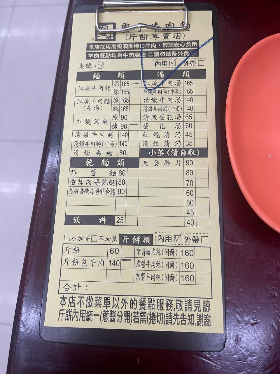 目前可以內用 斤餅不錯吃 但牛肉麵不合我的口味 價格不便宜 服務 內用