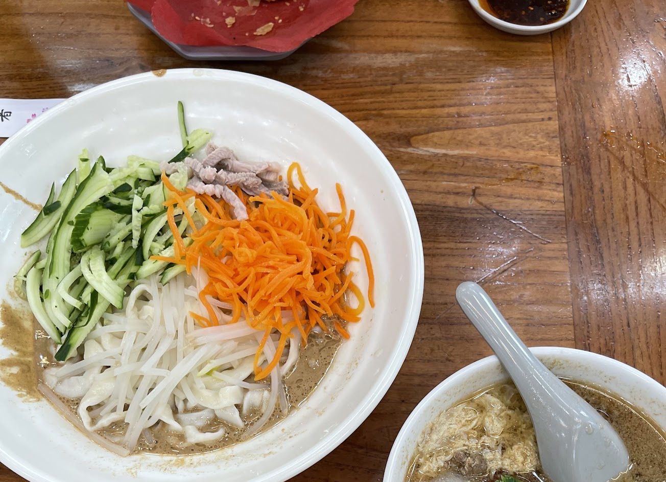 蘿蔔絲餅每次來必點,採用油炸方式烹調,多汁不油膩,一口咬下香氣撲鼻。蕃茄牛肉片蛋花湯表現也很棒,芝麻乾麵的芝麻香氣十足,搭配紅蘿蔔與小黃瓜絲非常清爽解膩,新竹很推薦的麵食館。