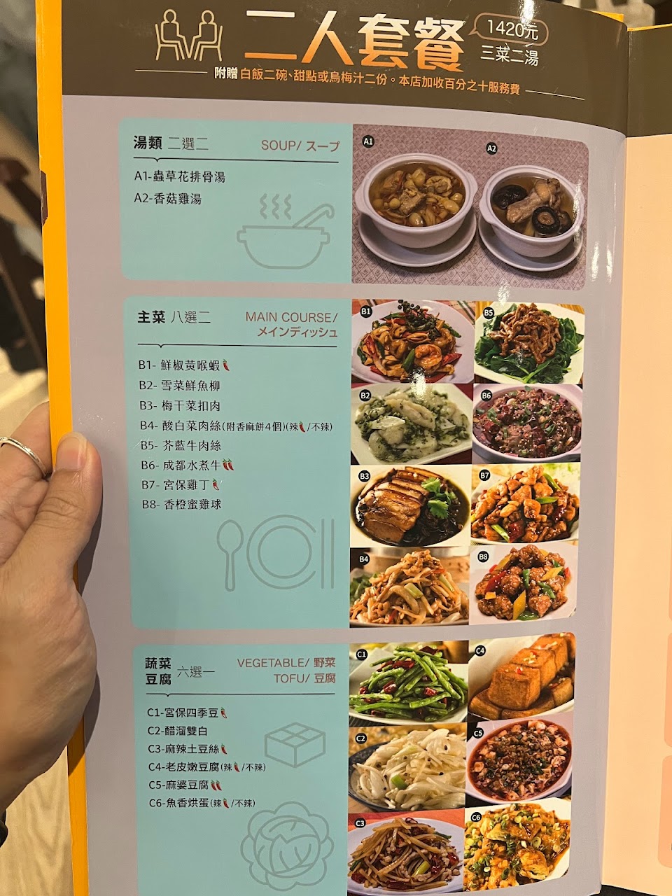 餐點部分都不錯,不太吃辣的我都還可以接受小辣的辣度,時蔬類都很清脆新鮮,湯品當日點的是連鍋湯,味道較清淡~
