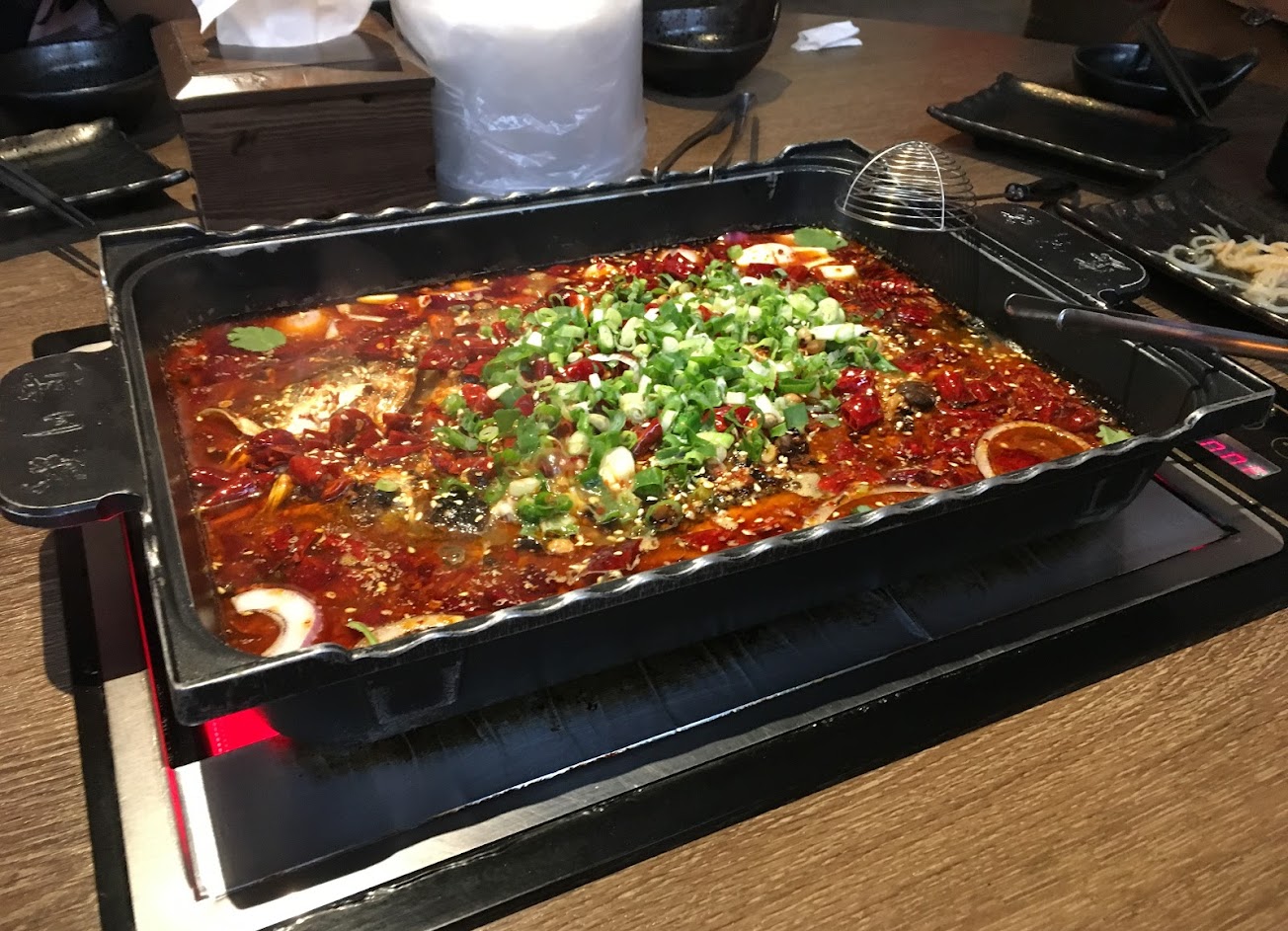 很特別的店 吃法有兩種 開始先選主鍋 我們今天點的是辣烤魚 我們先選擇小辣的程度 上菜後 果然一片紅 試吃第一口之後 我們發現小辣的程度還行 主要是麻 吃完之後整個嘴巴都是麻的 不到十分鐘 這條魚就被解決了