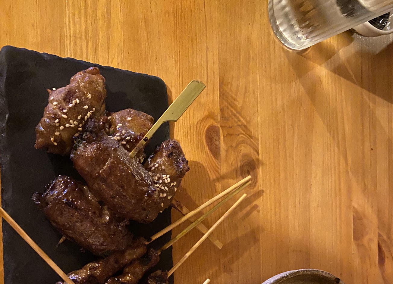 覺得油膩,串燒盤底剩下很多油,味道蠻膩口的,尤其是我第一次吃到這麼不爽口的燒肉蔥捲串燒,裡面捲的蔥非常難咬斷。