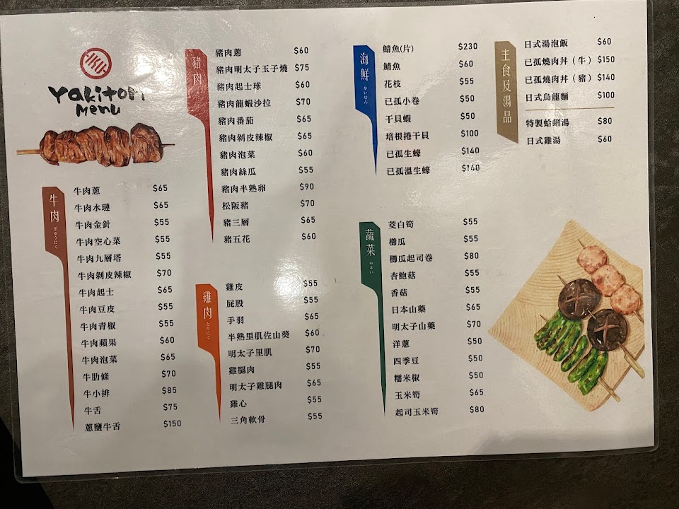 寵物友善環境!肉串口味多樣化,調味剛好,不夠可以自己再加七味粉或胡椒鹽 服務 內用 餐點類型 晚餐