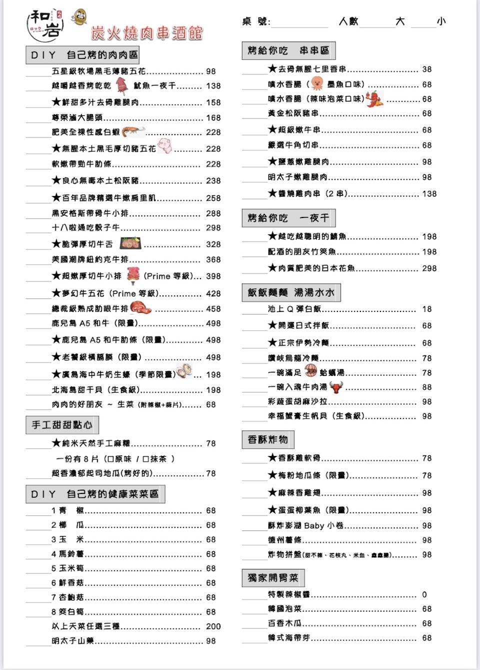 在菜單部分烤物類全部打叉以為不供應,但看到隔壁桌有烤串有點不解,因此詢問了一下才知道有供應,這點對一開始要點烤物的我們有點誤導。