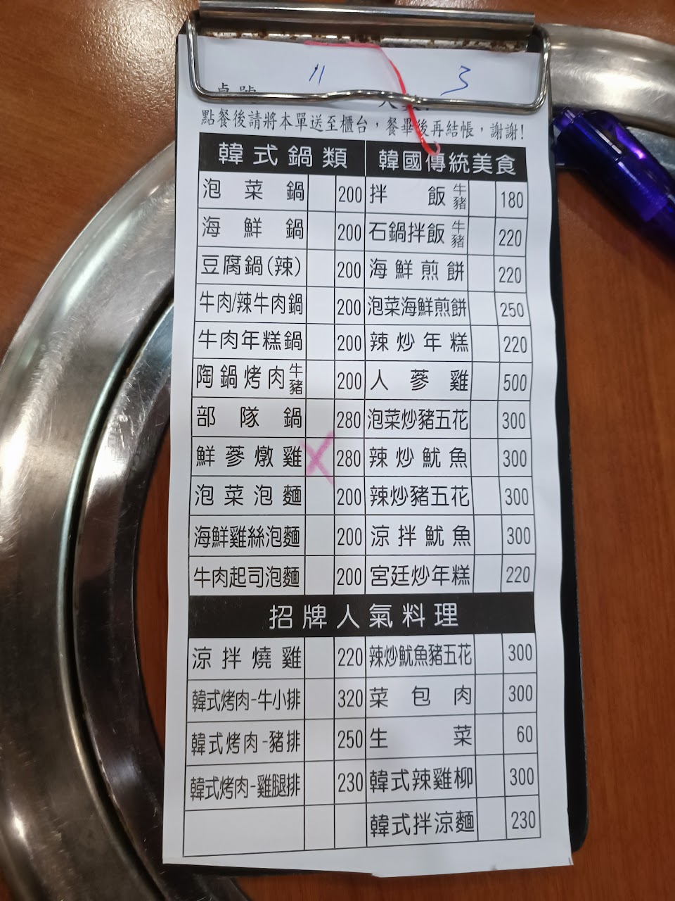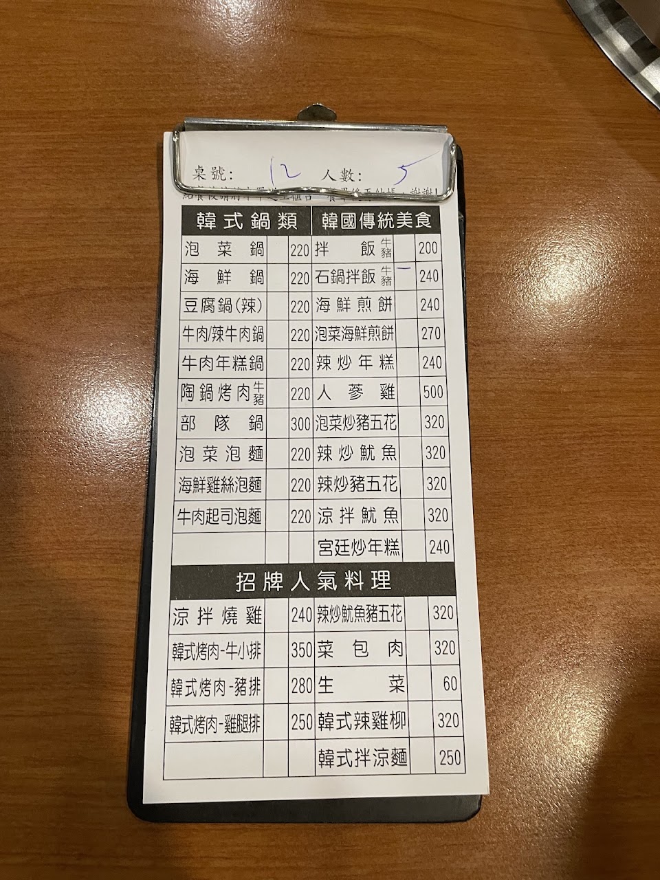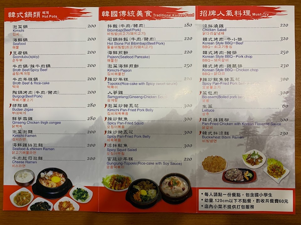除了自助區可以自己去夾菜夾肉 還有一個小菜單可以點菜 有 泡菜鍋 牛肉年糕鍋 石鍋拌飯 海鮮煎餅 辣炒年糕 涼拌燒雞