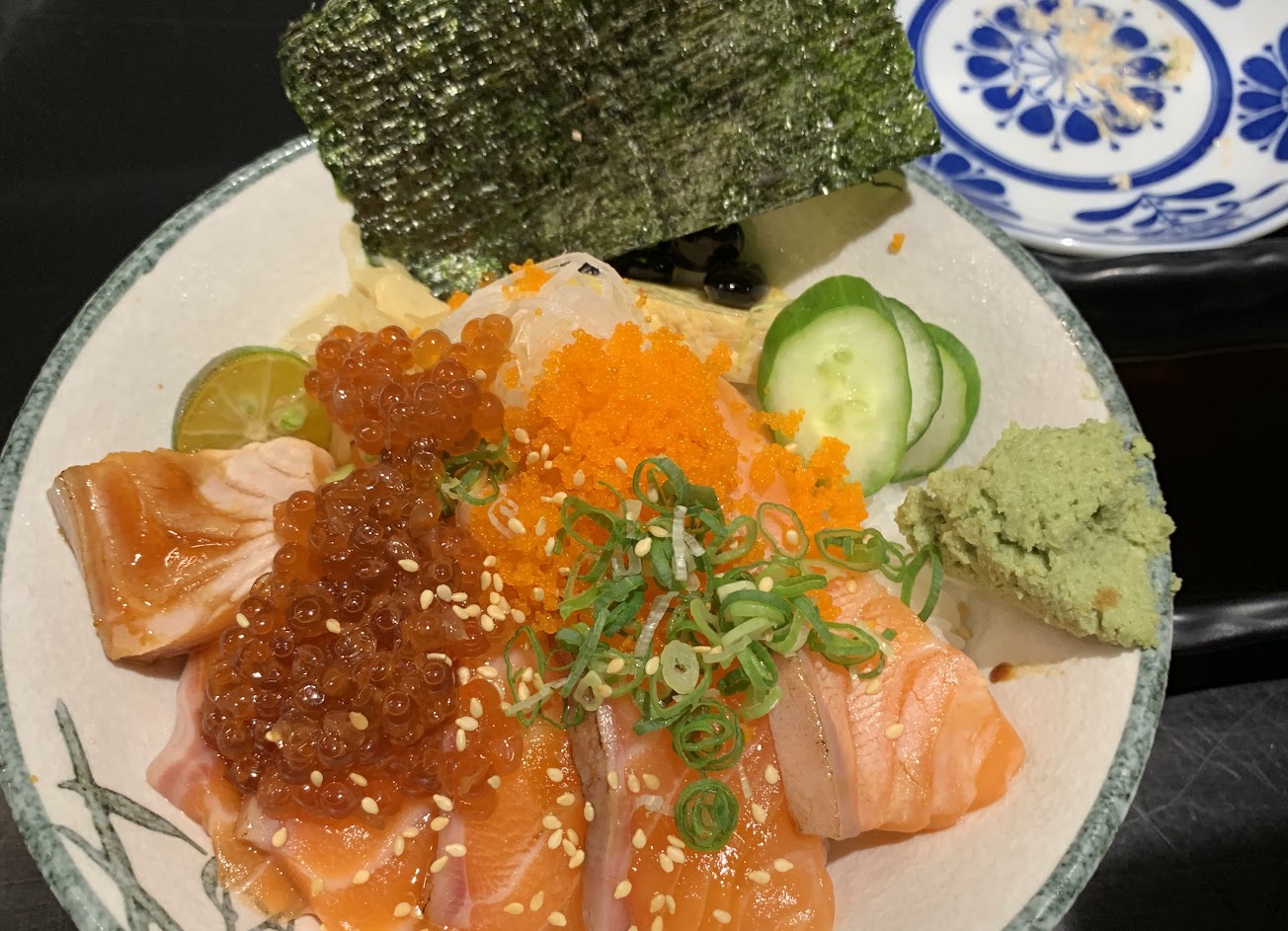 ?品項: 盛合海鮮丼 $245 鮭魚刺身 $130 燒肉沙拉 $130 明太子玉子燒 $100 柚子胡椒雞腿串 $55
